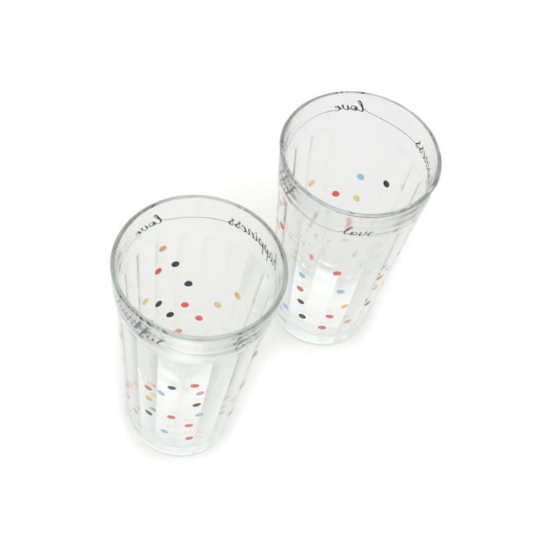 O Kit 2 Copos de Vidro Mini Dots 450 ml é super fofo. Perfeito para dar de presente em chás de casa nova, open house e afins.