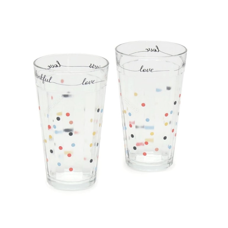 Prático, este kit vem com dois copos de vidro estampados com bolinhas coloridas e a palavra “thankful”. Ideal para usar na cozinha, sala de jantar, varanda gourmet e muito mais!
