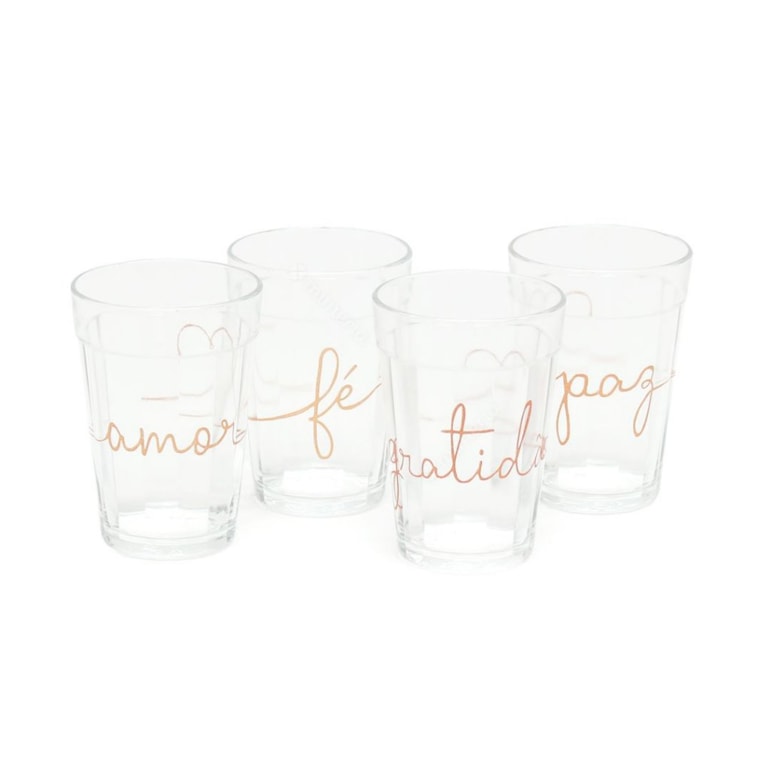 Lindo, este kit vem com quatro copos de vidro, cada um estampado com uma palavra em letras cursiva na cor rose gold: “Fé”, “Gratidão”, “Paz” e “Amor” com detalhes em ouro. Um charme de kit para você usar e decorar sua casa!