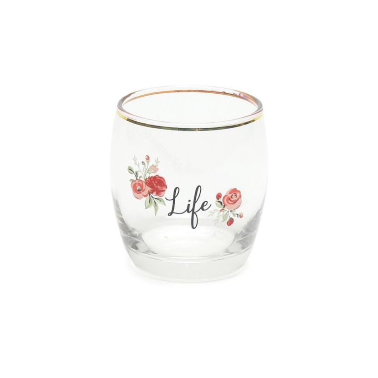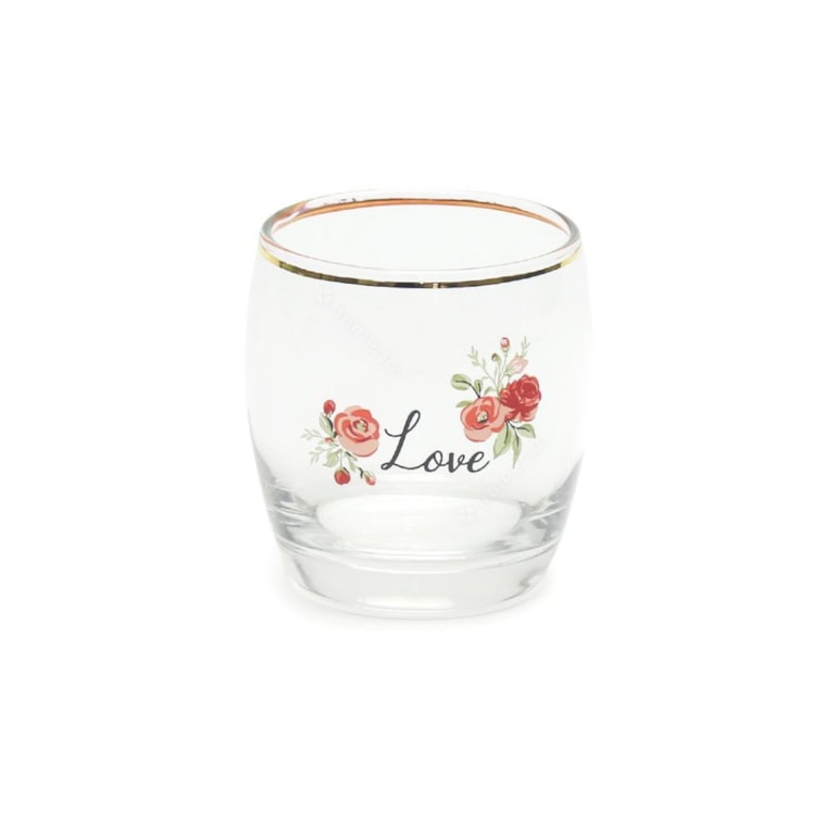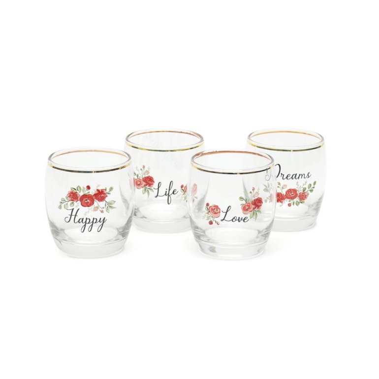O Kit 4 Copos de Vidro Romance Gold Rock 330 ml vem com copos estampados com flores e as palavras: “Love”, “Life”, “Happy” e “Dreams” em fundo transparente com detalhes na borda dourados filetados em ouro. Perfeitos para aquela ocasião especial. Um charme!