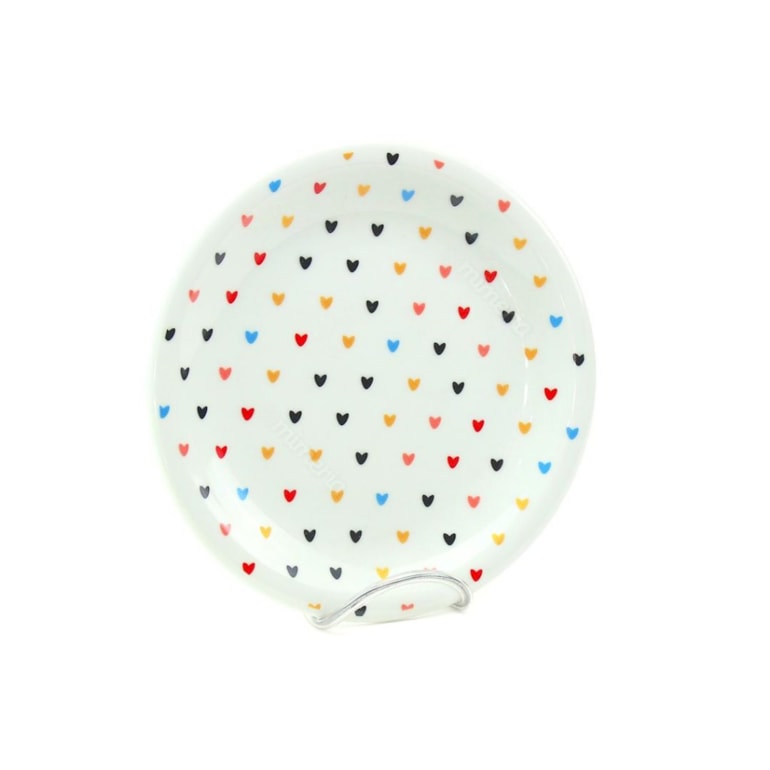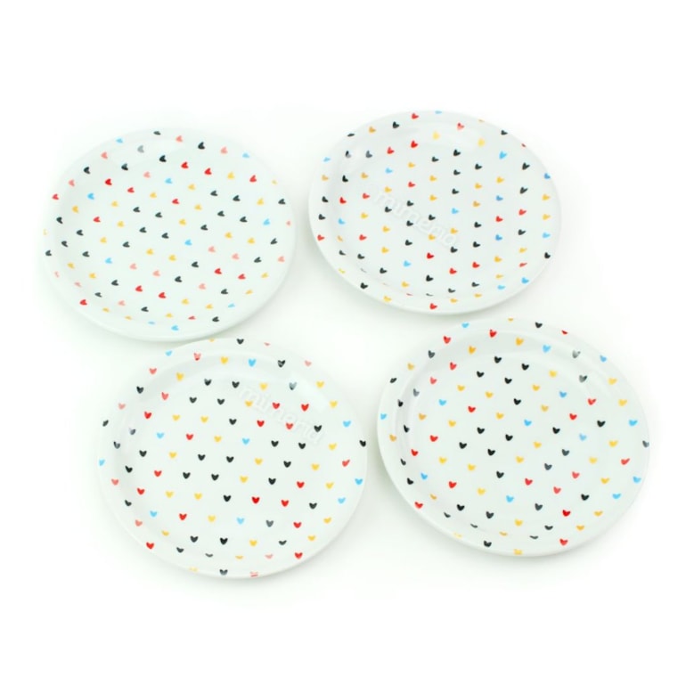 Produzido em porcelana de alta qualidade, este kit vem com quatro pratos de sobremesa com ótimo acabamento e linda estampa de corações coloridos em fundo branco. Um charme!