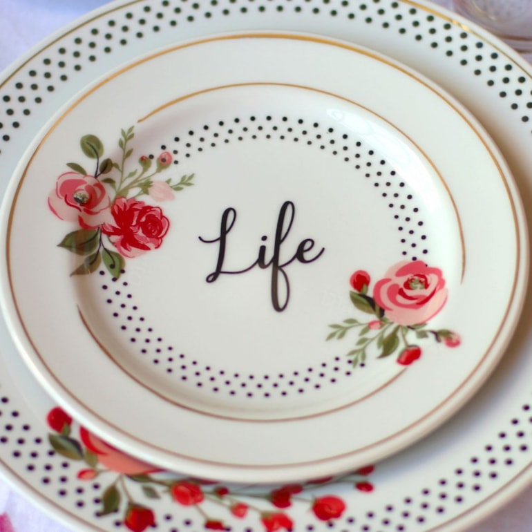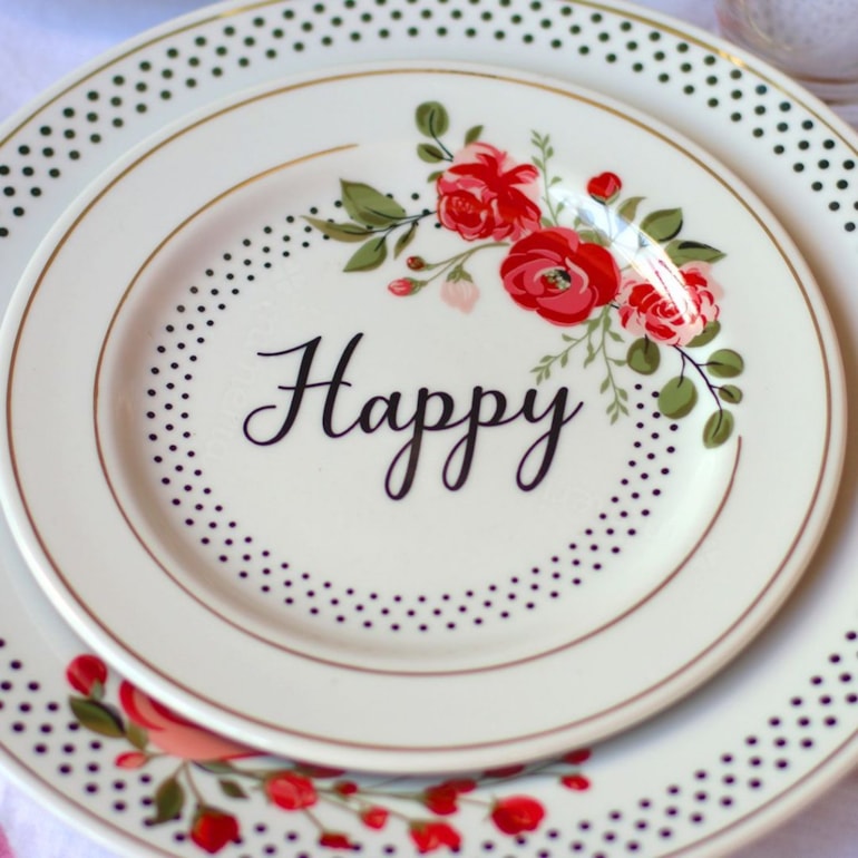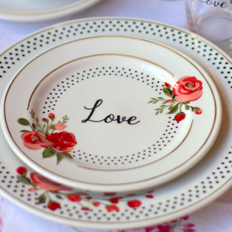 Lindo, este kit vem com quatro pratos de sobremesa estampados com flores e as palavras: “Love”, “Dreams”, “Life” e “Happy” em fundo branco com detalhes em dourado filetados em ouro. Um verdadeiro mimo cheio de muito requinte!