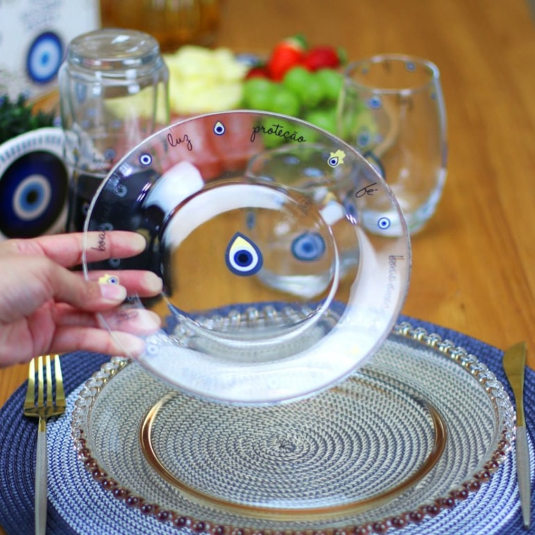 Produzido com vidro resistente e de muita qualidade, os pratos apresentam estampas de Olho Grego e Mão de Fátima na borda, contornados com dourado e traços delicados. Há também palavras que emanam positividade – “Boas energias, proteção”, “fé” e “luz”. É tudo de bom, né?