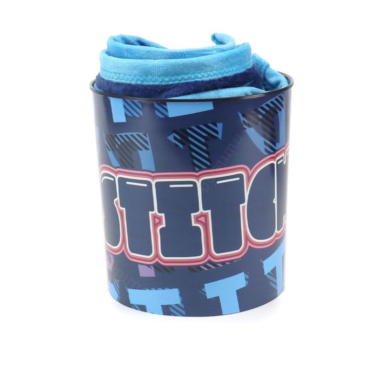 O Kit Balde de Pipoca e Manta Stitch é incrível para quem ama maratonar stitch! Ele vem estampado com o bichinho, e mistura padrões de azul, mais as cores e traços originais do desenho. É absolutamente encantador!