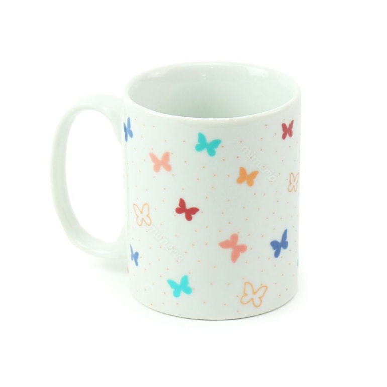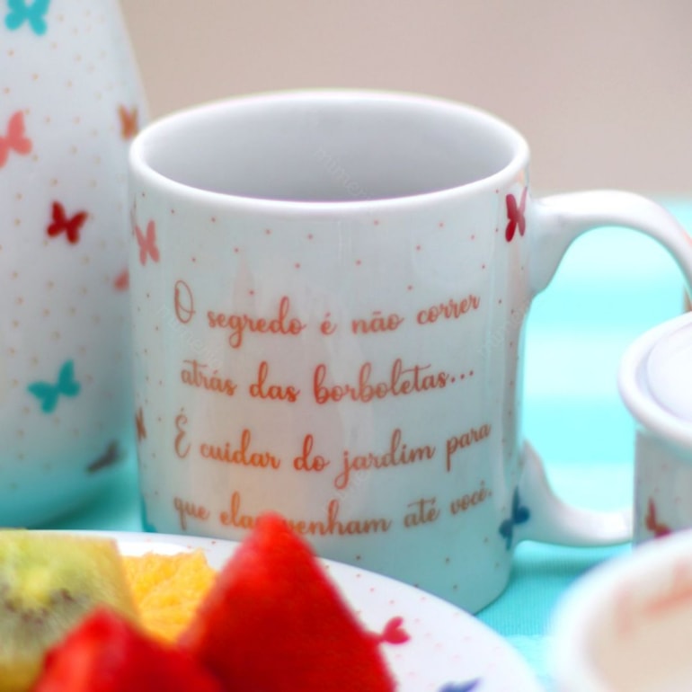 Produzido em porcelana de altíssima qualidade, este kit tem ótimo acabamento e linda estampa de borboletas coloridas e frases alto astral. Perfeito para presentear pessoas queridas em chás de casa nova ou renovando a decoração!