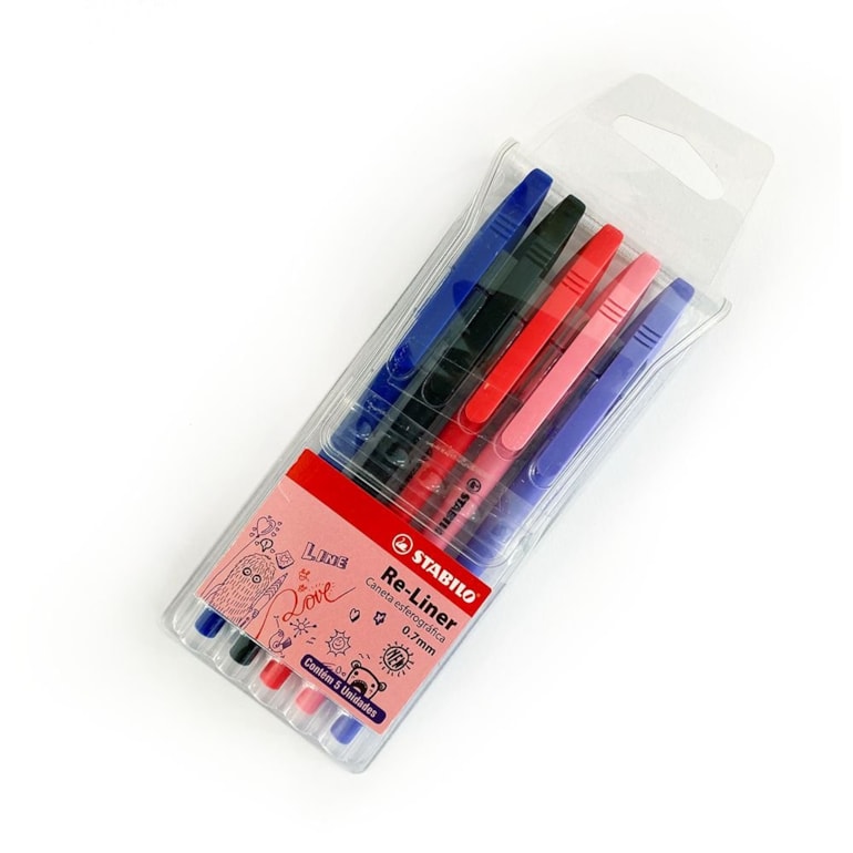 - Kit Canetas Esferográficas Stabilo Re-Liner com 5 Cores;