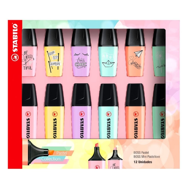 - Kit Canetas Marca Textos Stabilo Boss e Mini Love Tons Pastéis com 12 Unidades;