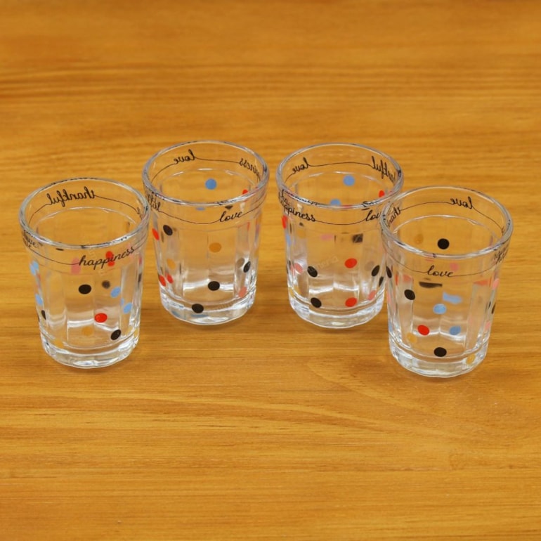 O Kit com 4 Mini Copos de Vidro Mini Dots 45 ml é perfeito para presentear pessoas queridas em open house e afins.