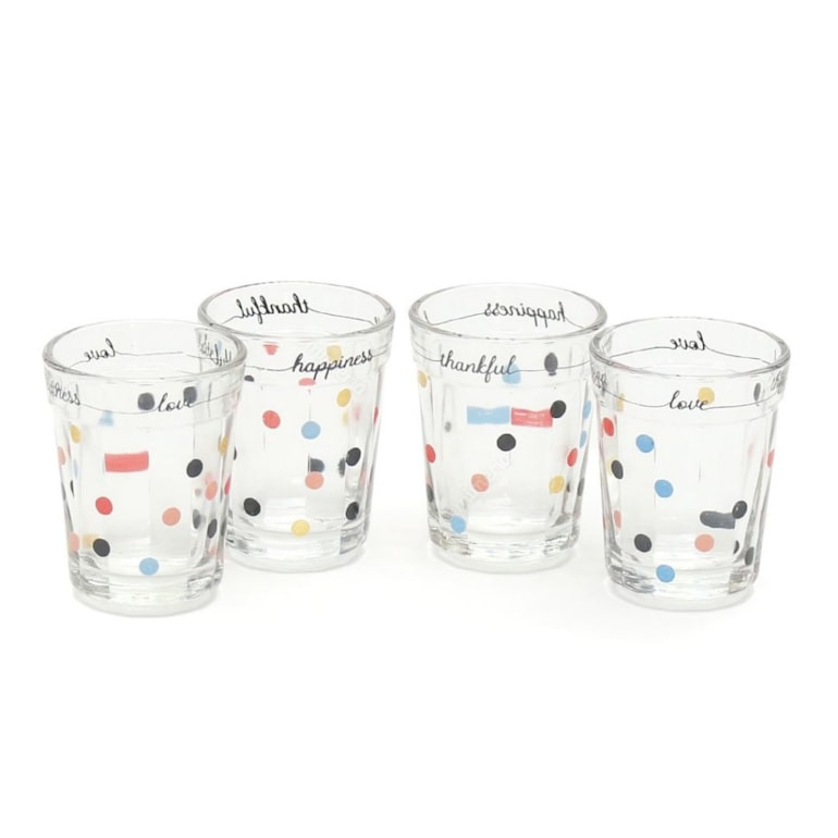 Produzido em materiais de alta qualidade, este kit vem com 4 copinhos de vidro estampados com bolinhas coloridas e as palavras: “love”, “happiness” e “thankful” em fundo transparente. Um charme!