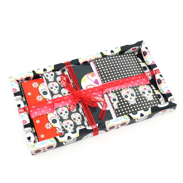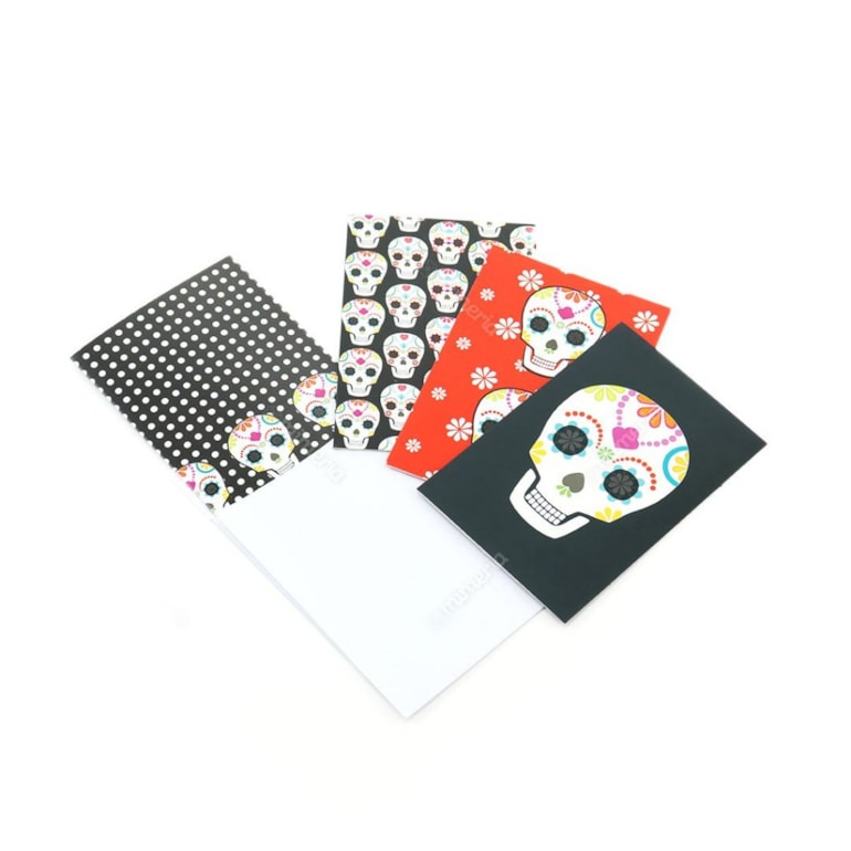 Com lindos cartõezinhos, este kit vem com 16 folhas brancas (para escrever o texto) e a mesma quantidade de envelopes estampados com caveiras fofas e divertidas em fundo de cores variadas. Um mimo!