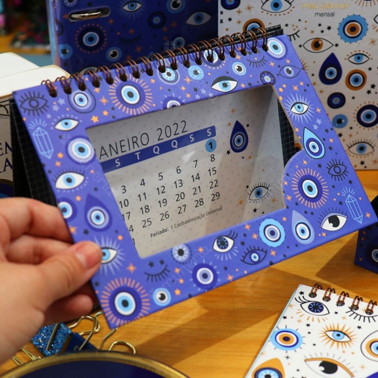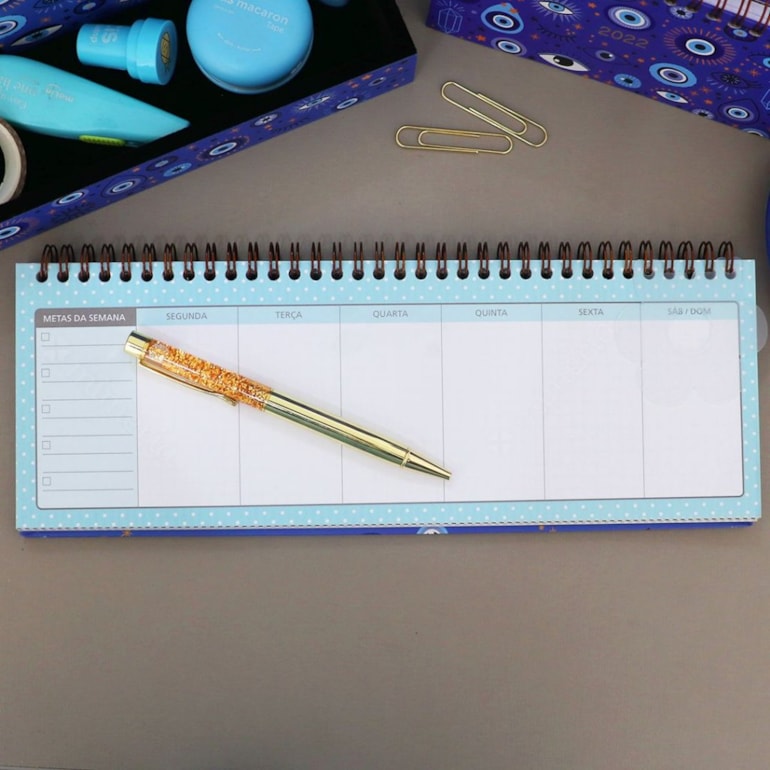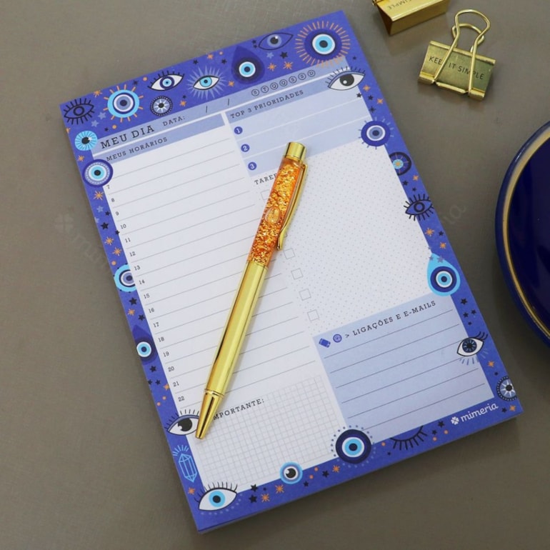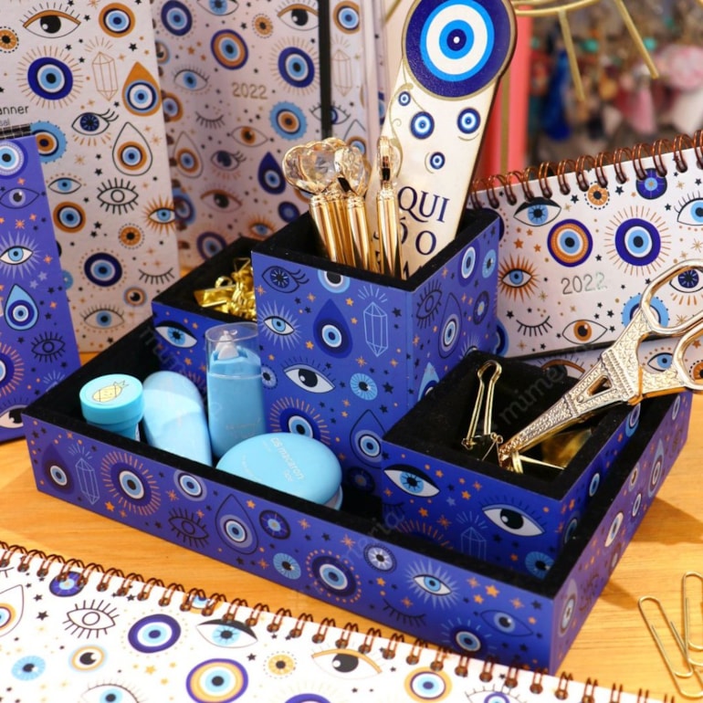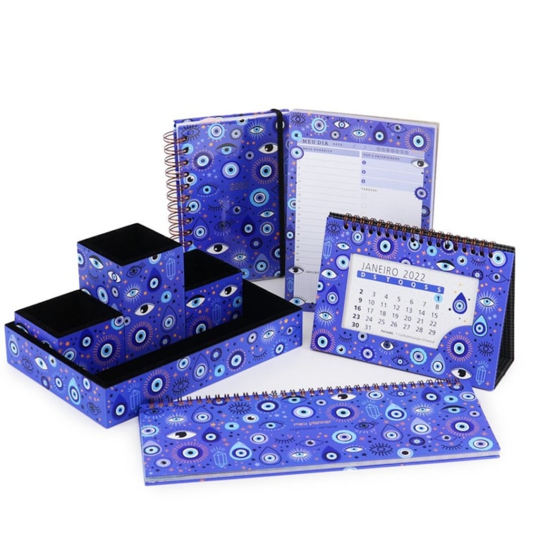 Você merece traballhar e estudar numa mesa linda e cheia de boas energias. O Kit de Papelaria Completo Olho Grego Azul é perfeito para você para organizar todos seus itens de papelaria que ficam soltos pela sua mesa, além de enfeitar seu ambiente com muito estilo e ajudar você a planejar seu dia a dia.