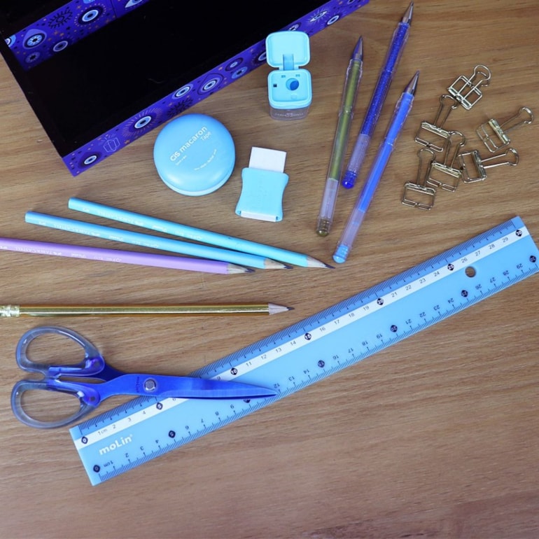 - Conteúdo: 1 Kit de Clipes de Papel Dourado; 1 Régua Milimetrada 30 cm Azul Pastel; 1 Lápis HB Dourado com Borracha na Ponta; 1 Organizador de Mesa Olho Grego Azul; 1 Tesoura Titanium Azul; 1 Fita Corretiva CIS Macaron Azul; 1 Apontador Faber-Castell com Depósito Mini Box Azul Pastel; 1 Borracha Faber-Castell Max Azul Pastel; 1 Caneta Gel com Glitter Uniball Signo Sparkling Azul; 1 Caneta Gel Metalizada Uniball Signo Noble Metal Dourada; 1 Caneta Gel Uniball Signo Angelic Azul Pastel; 1 Ecolápis Faber-Castell Max Verde Pastel; 1 Ecolápis Faber-Castell Max Lilás Pastel; 1 Ecolápis Faber-Castell Max Azul Pastel.