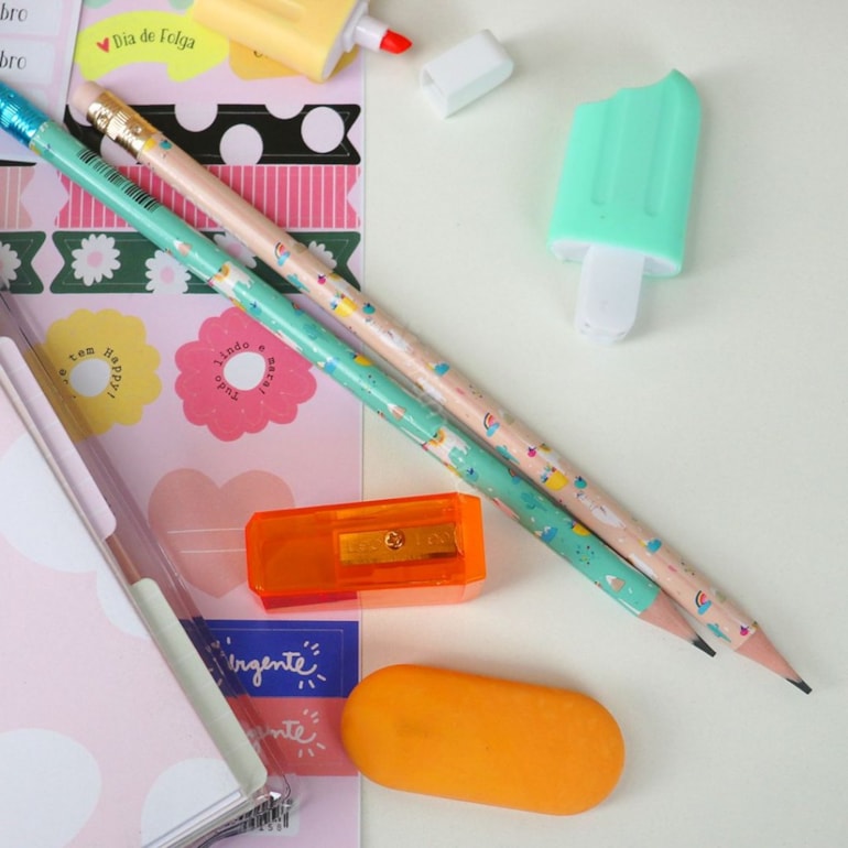 Bastante preciso, conta com dois lápis HB pretos, uma borracha e um apontador, um mimo! Vem com um lápis salmão e um lápis verde, ambos com borrachas na ponta e estampados com lhamas, cactos e arco-íris, tudo isso atrelado a uma borracha grande e um apontador com depósito, ambos na cor laranja!