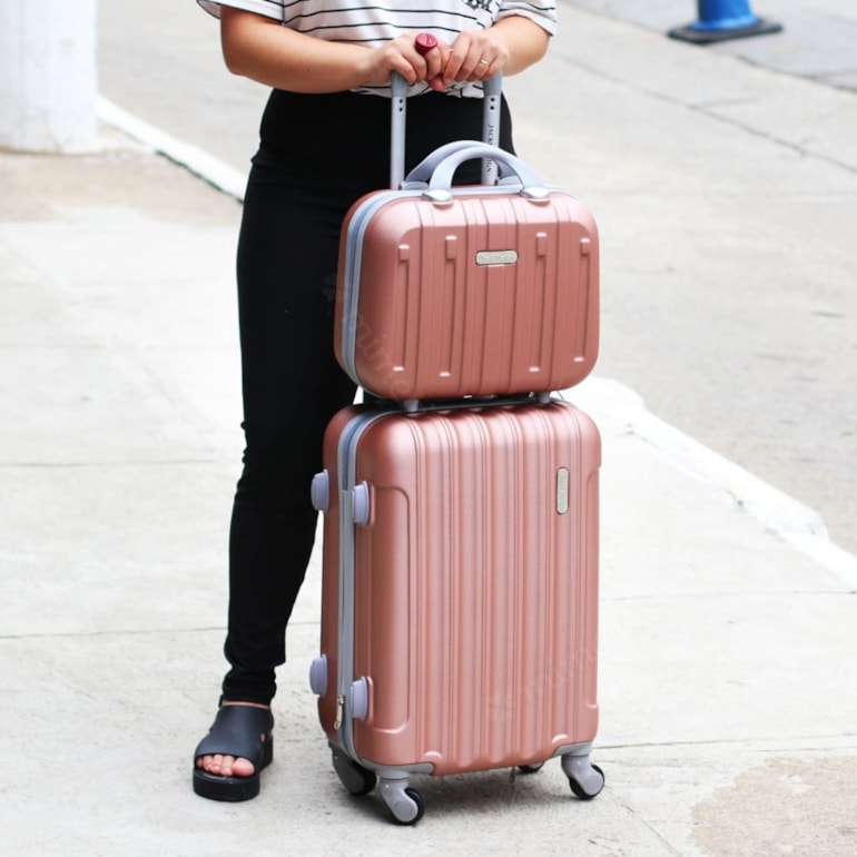 - Kit Mala de Viagem com Rodinhas e Frasqueira Trip Rose Gold e Prata;