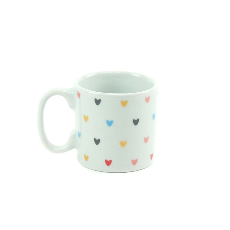 O Kit Mini Caneca de Porcelana com Coador Coração tem uma caneca com uma linda estampa de coraçõezinhos coloridos em fundo branco. Ideal para você usar, decorar ou presentear pessoas queridas em chás de casa nova e afins.