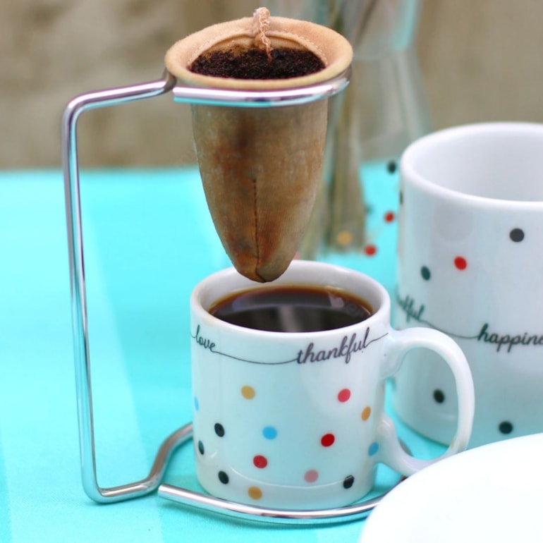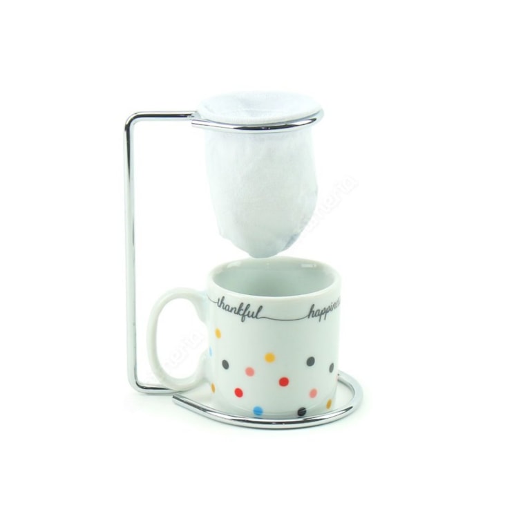 Produzido em materiais de alta qualidade, esta caneca é feita em porcelana e conta com coador de pano e suporte de metal. Ótima para você usar e decorar sua cozinha, sala de jantar ou cantinho do café com muito charme e personalidade.