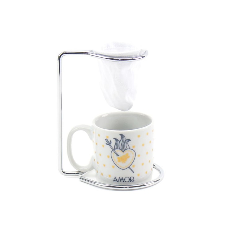 Prática, esta caneca tem capacidade de 100 ml e vem com suporte de alumínio e coador de café em pano. Ideal para fazer cafés fresquinhos de forma tradicional. Um charme!