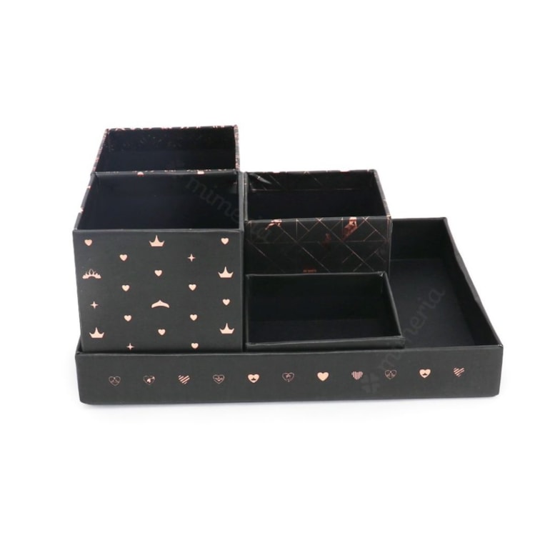 Belíssimo, super delicado, e estampado com o máximo de delicadeza, esse kit vem composto por 5 peças, sendo dois porta objetos grandes, um porta objeto médio e um porta objeto pequeno, todos sobre uma espaçosa e decorada bandeja! Todas as suas peças são resistentes e produzidas em papel offset, e ele é absolutamente perfeito para organizar os seus acessórios de escrita na sua mesa de estudos ou trabalho, da maneira mais cômoda e encantadora possível!