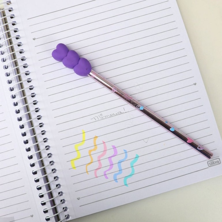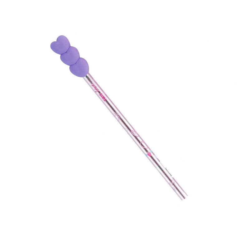 Com estampas metalizadas e meigos corações desenhados no corpo do lápis, ele também tem uma borracha lilás, de ponteira, em formato de coração. Uma graça, né?