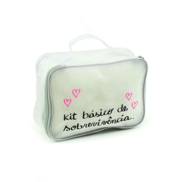 Muito fofa, ela conta com uma alça de mão em seu topo e tem seu fechamento em zíper, vem trabalhada toda em plástico transparente e estampada com a frase “kit básico de sobrevivência” com alguns coraçõezinhos estampados e detalhes em cinza!