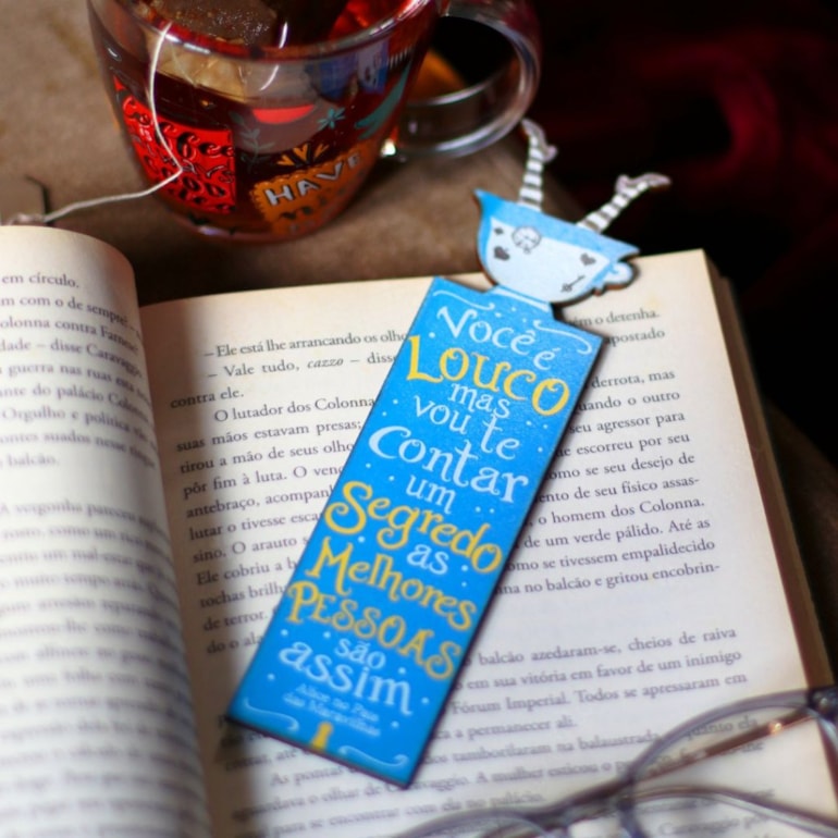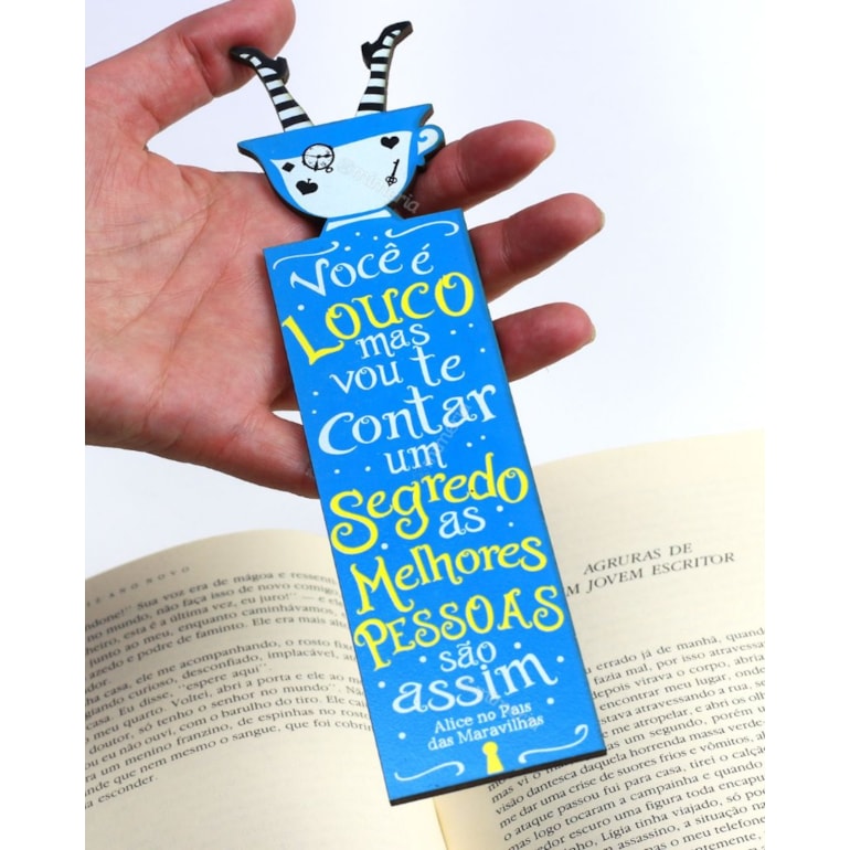 Perfeito para marcar a página do livro, o Marcador de Livro Alice é um mimo! Produzido em madeira, traz o formato de uma xícara, com os naipes do baralho, além das pernas de uma menina, saindo de dentro da xícara. Com fundo azul, traz os dizeres: "Você é louco, mas vou te contar um segredo, as melhores pessoas são assim!" - referência à "Alice no País das Maravilhas" de Lewis Carroll.