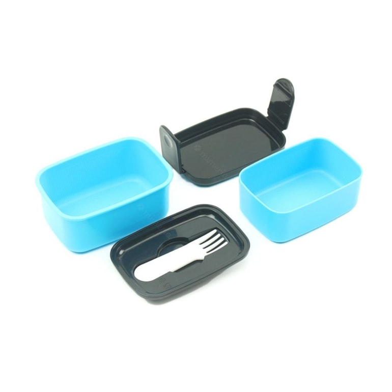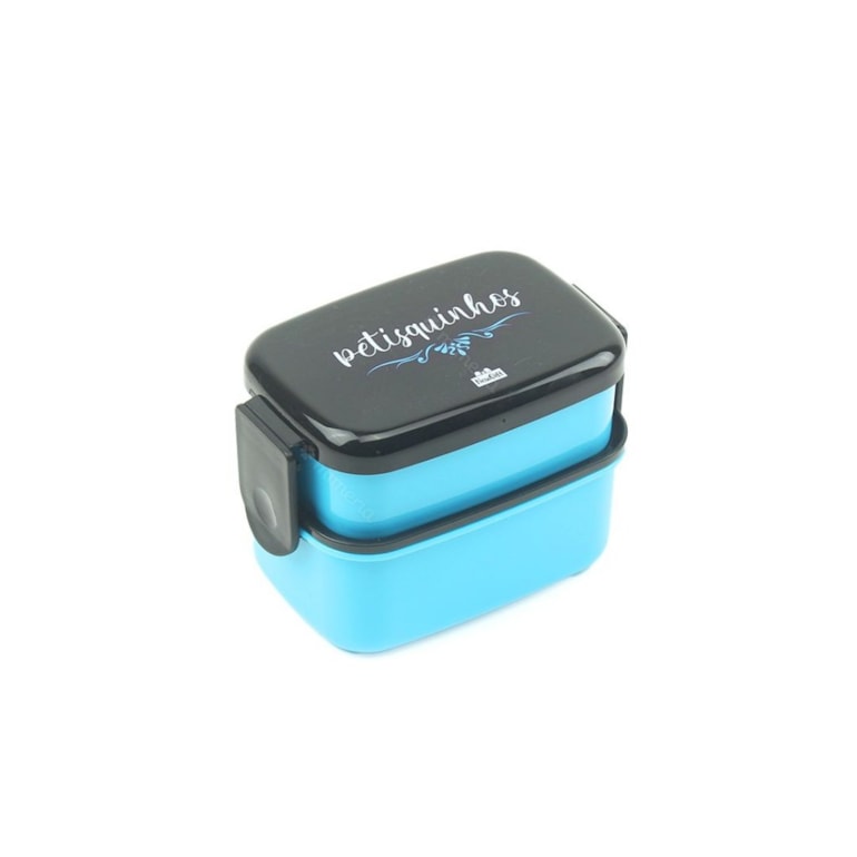 Produzida em plástico resistente, conta com dois andares e um divisão que comporta um garfinho entre os seus potes! Ela vem trabalhada em tons de azul e preto e conta com travas de segurança laterais, vem estampada com a palavra “petisquinhos” em seu topo e é ótima para ser colocada na sua bolsa em conjunto com sua marmita habitual!