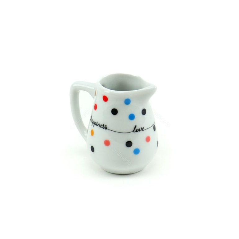 Feita em porcelana, esta jarrinha tem acabamento impecável e linda estampa com as palavras: “Happiness love” em fundo branco com confetes coloridos. Um charme de peça para você usar e decorar o ambiente com muito charme!