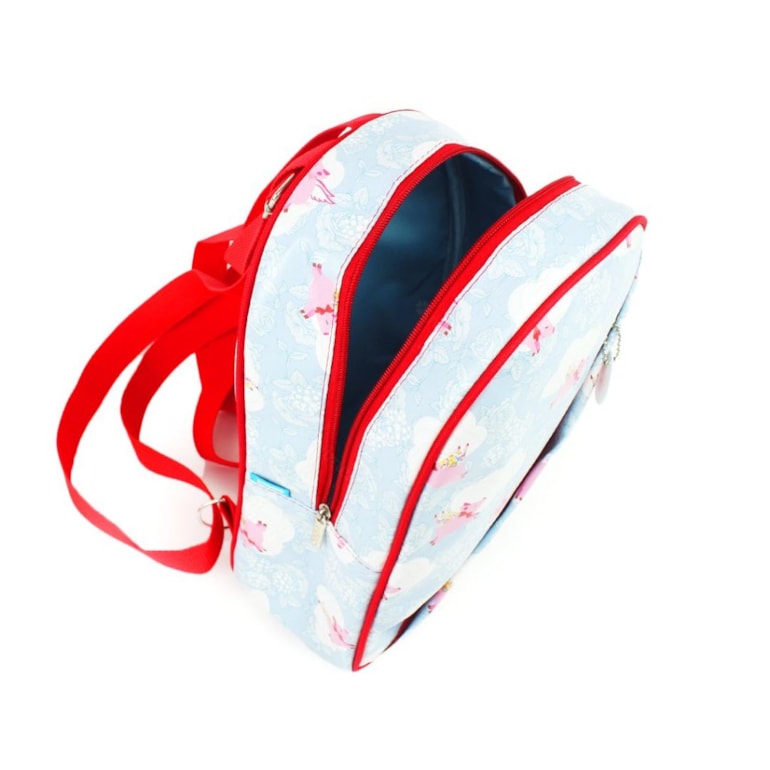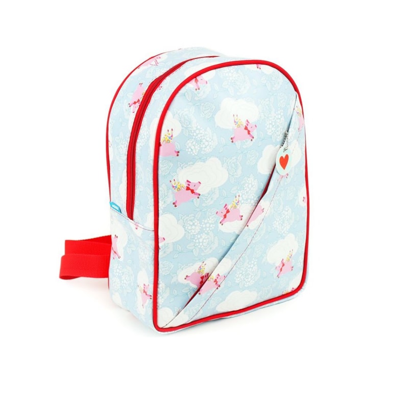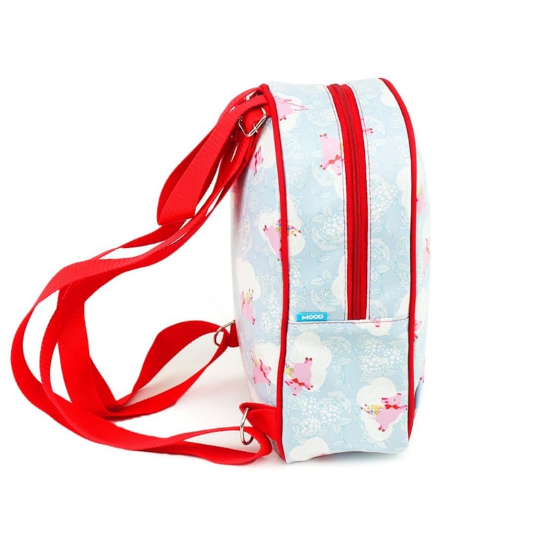 A Mochila Estampada Casual Porquinho Tudo é Possível e tem linda estampa com porquinhos de asas em fundo listrado azul. Um verdadeiro mimo para você combinar com outros acessórios da mesma coleção!