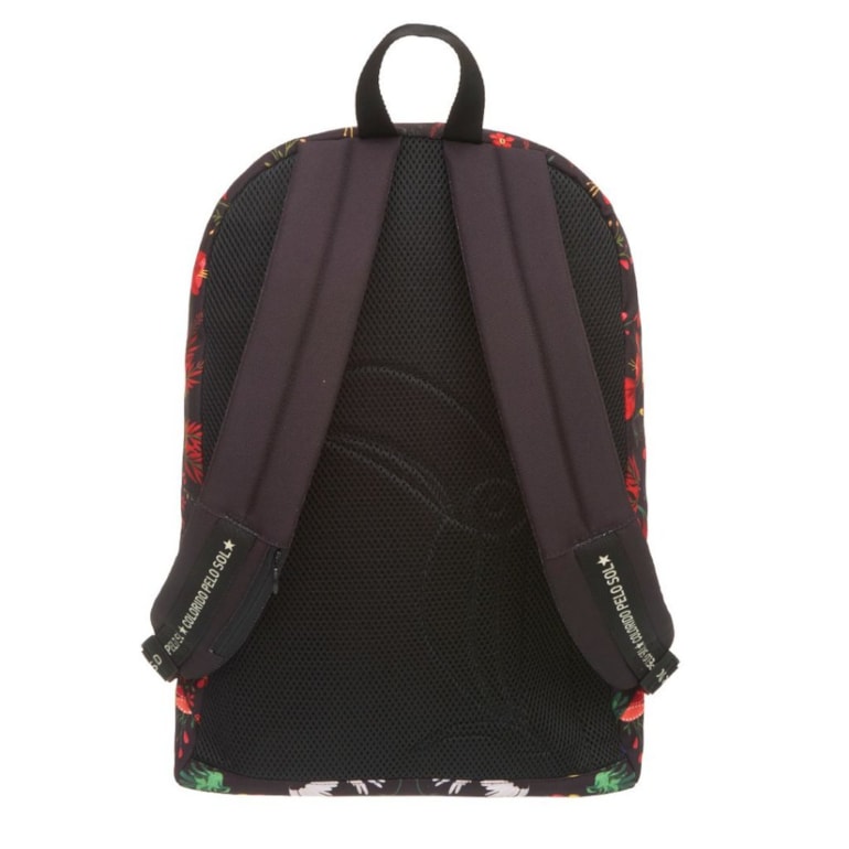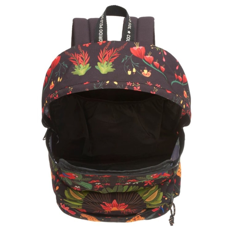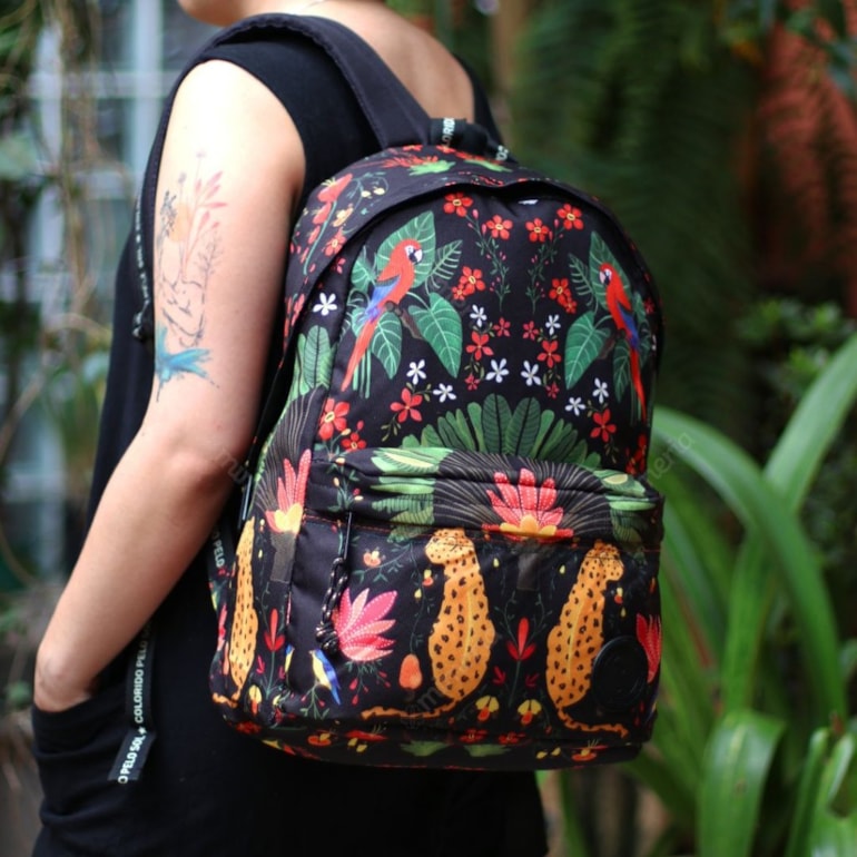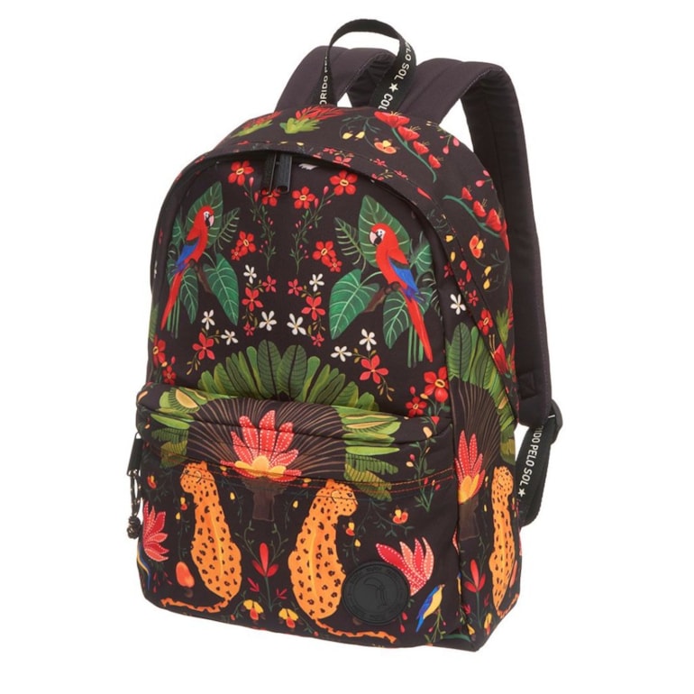 Linda, esta mochila vem estampada com flores, folhas e animais da selva (como onças e araras) em fundo preto. Um charme de acessório para você combinar com os mais variados looks ou presentear pessoas queridas em datas especiais!