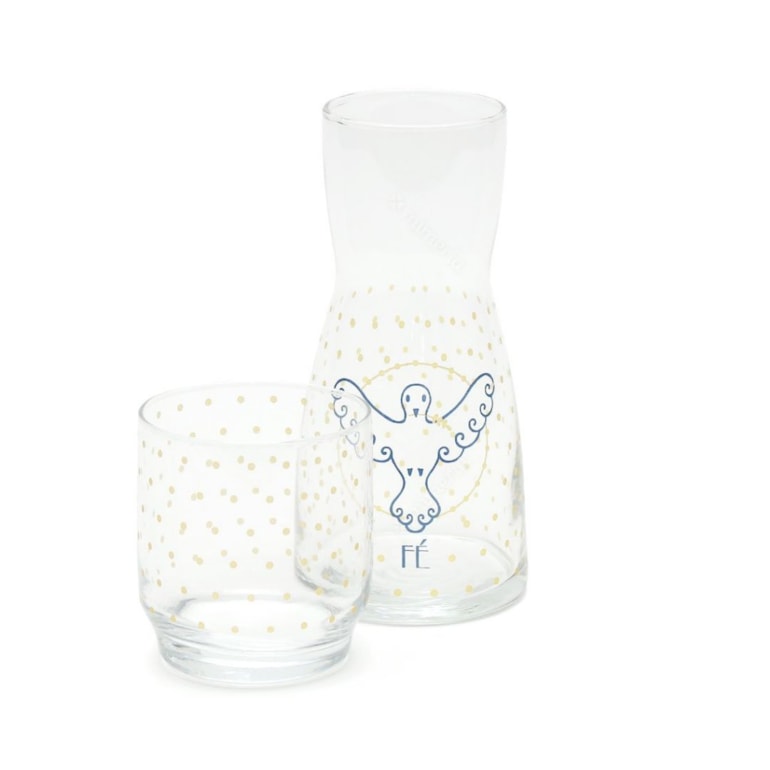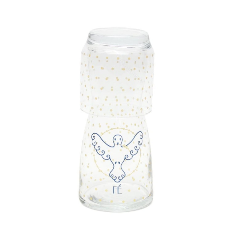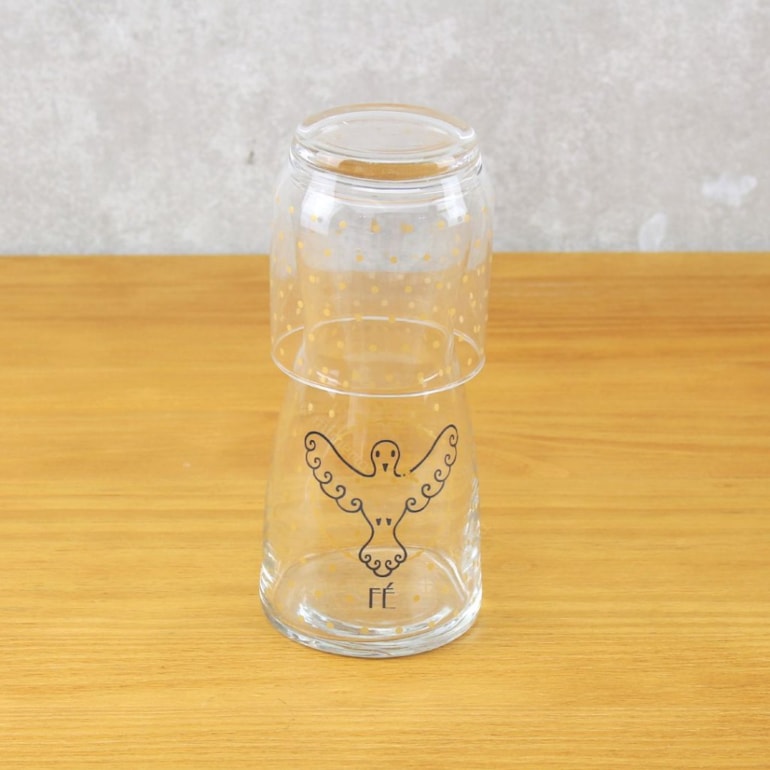 A Moringa de Vidro Vida e Fé 500 ml tem estampa linda com a pomba da paz e a palavra: “Fé” em fundo transparente com coraçõezinhos dourados. Um super mimo!