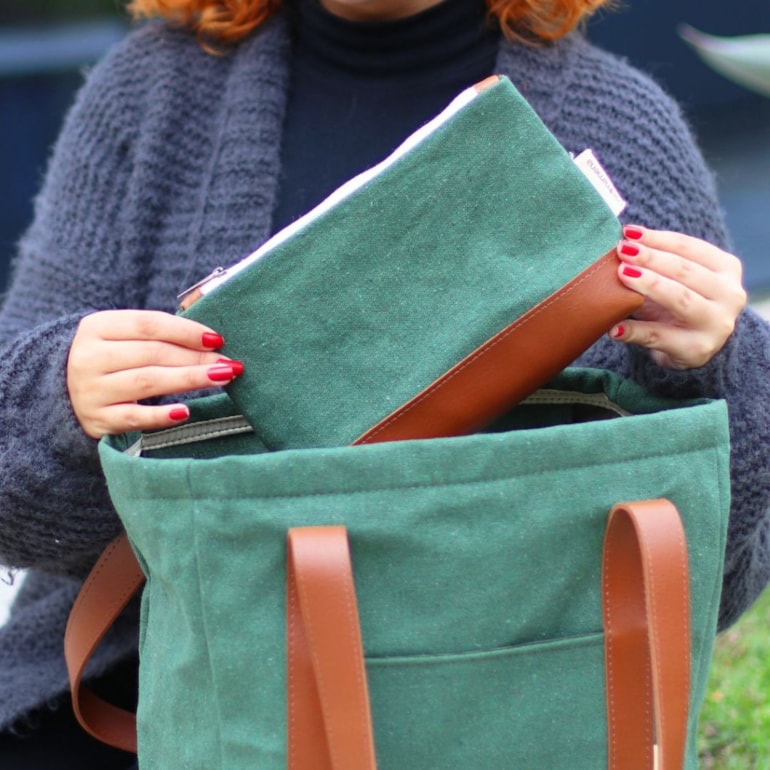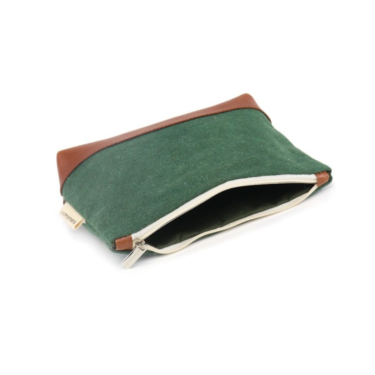 Muito charmosa, vem produzida com lona de algodão, e tem excelente qualidade! Ela é espaçosa e vem trabalhada em um belíssimo tom de verde floresta! Conta com detalhes em marrom, e fechamento em zíper. É perfeita pra ser guardada dentro da sua bolsa!
