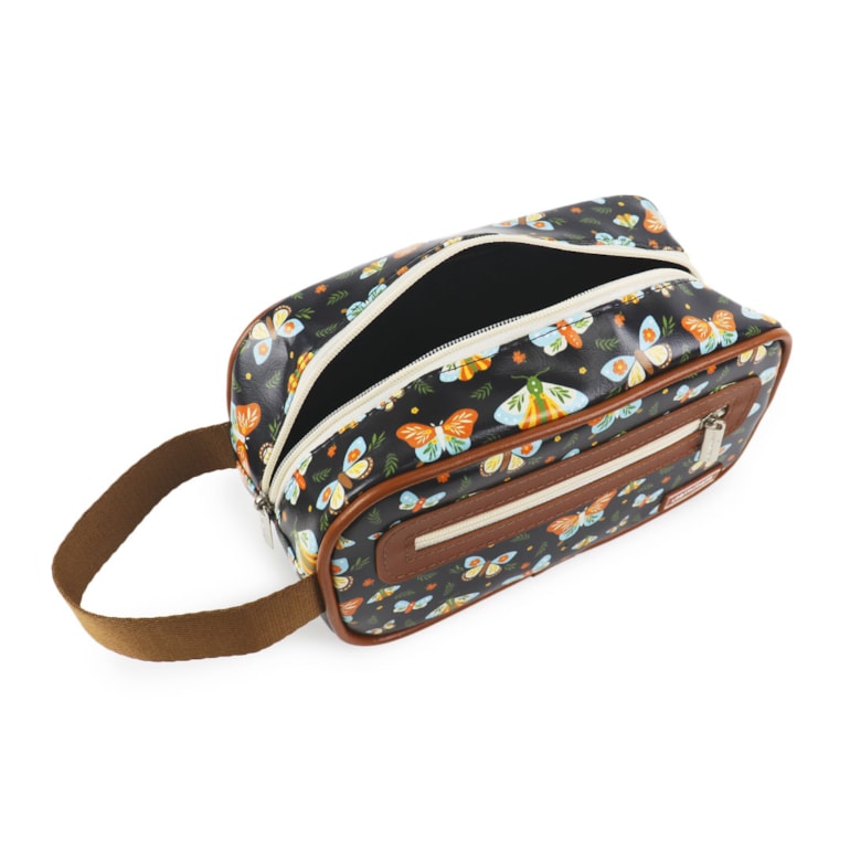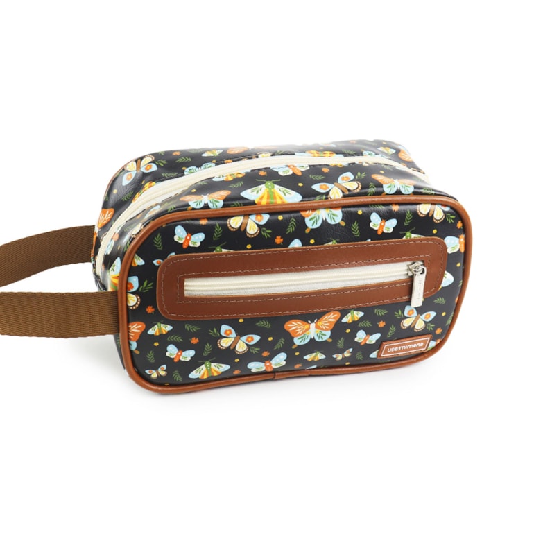 A Necessaire de Viagem com Alça Mariposa é tem várias mariposas e borboletas nas cores azul, laranja e verde, numa combinação perfeita, rodeadas por florzinhas pequenas, num fundo escuro que remete à noite. O mimo ideal para você combinar com outros acessórios da mesma coleção, ela pode ser levada dentro da sua bolsa!