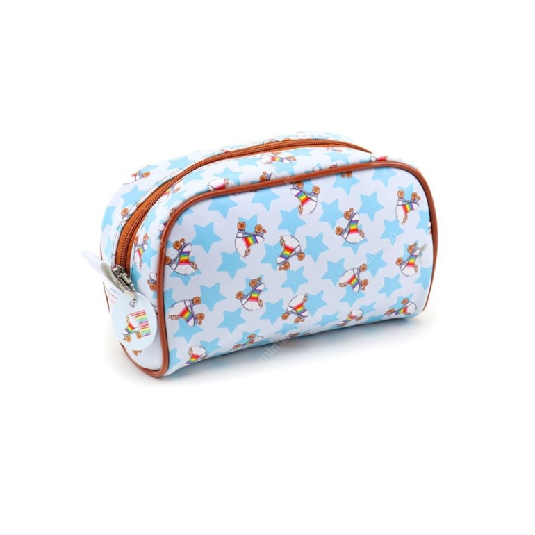 Produzida em materiais de ótima qualidade, esta necessaire tem fechamento em zíper e linda estampa de patins e estrelinhas em fundo azul com detalhes em marrom. Não é uma graça?