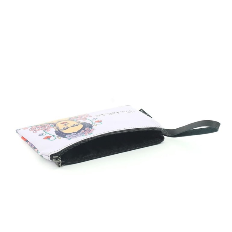 A Necessaire Estampada Pequena Frida Kahlo Flor de Maracujá tem fechamento em zíper e vem com uma alcinha, além de contar com linda estampa do retrato da Frida e flores de maracujá em fundo branco com detalhes lilás e rosa.