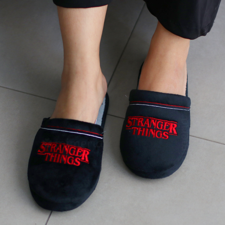 Com fundo preto, na parte da frente vem escrito “Stranger Things” com a própria caligrafia e design da série. No solado tem outros dizeres “The Upside Down”, em fundo preto e sombreado vermelho. É incrível! Além disso, a pantufa é confeccionada com três tipos de espumas: EPE, EVA e borracha, o que proporciona resistência a ela e maior conforto para os seus pés.