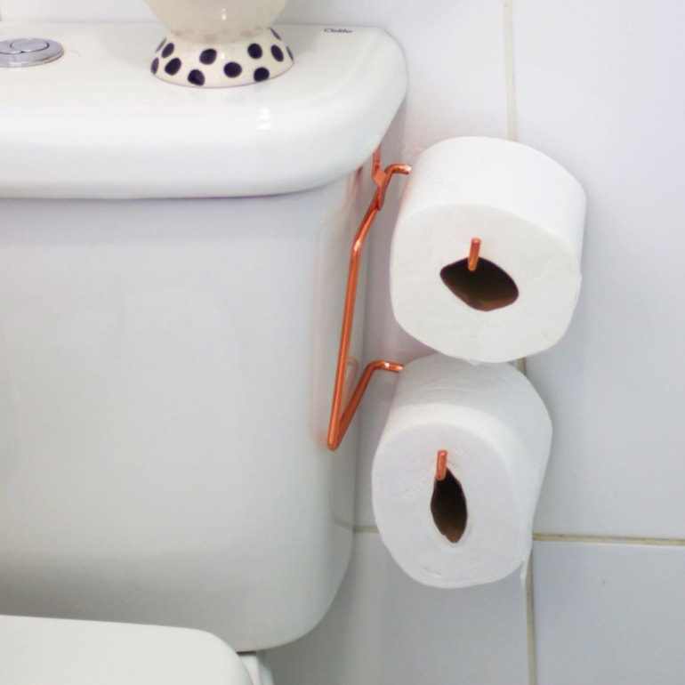 O Papeleira Dupla para Caixa Acoplada em Aço Rose Gold tem um gancho para se encaixado na caixa do vaso sanitário, o que permite mais comodidade a você. Ele vai deixar o seu banheiro impecável e extremamente organizado!
