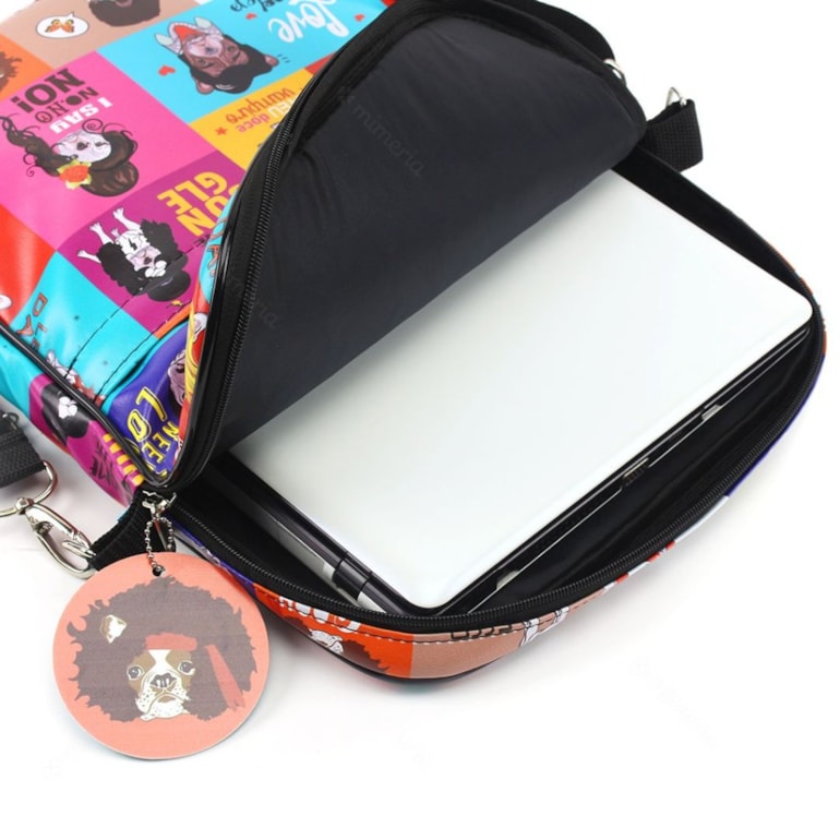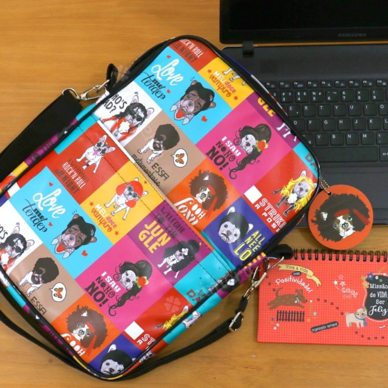 Produto funcional, prático e super diferenciado, excelente para pessoas que gostam de praticidade, sem perder o estilo. Fabricada em nylon sintético e estampado com cachorros fofos da raça bulldog francês com referência a grandes celebridades. Incrível! Esse porta notebook é ótimo para você guardar seu note e deixá-lo sobre a mesa em home office para o trabalho.