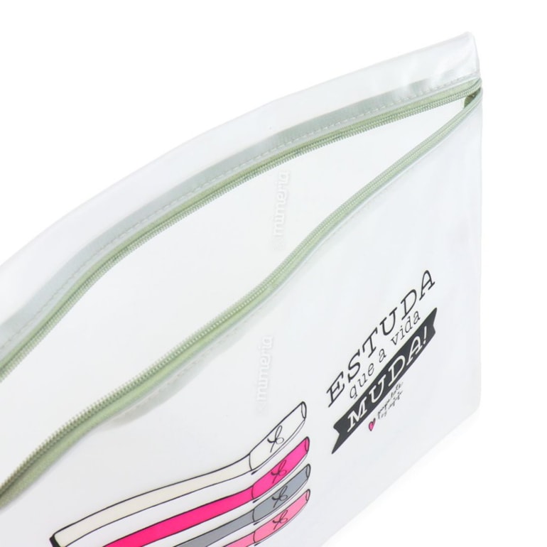 Com design único, esta pasta tem fechamento em zíper e estampa super fofa de canetas e da frase: “Estuda que a vida muda” em fundo transparente. Um verdadeiro mimo!