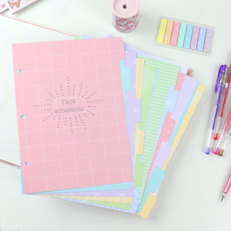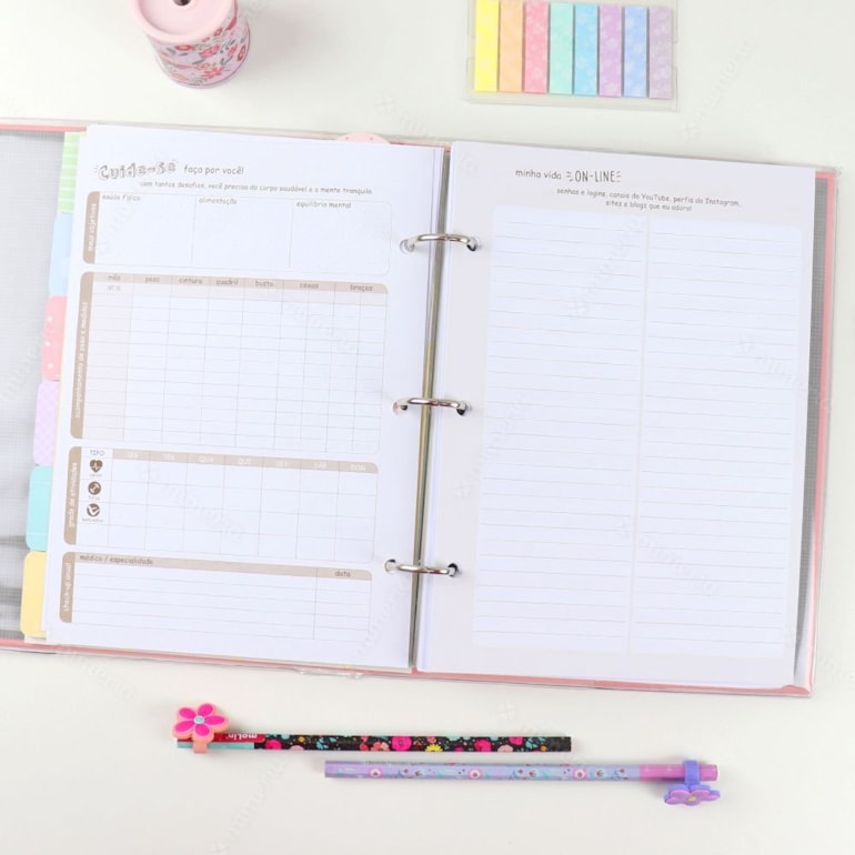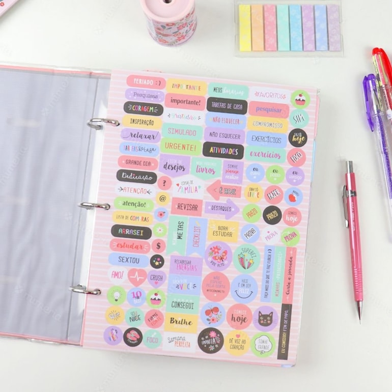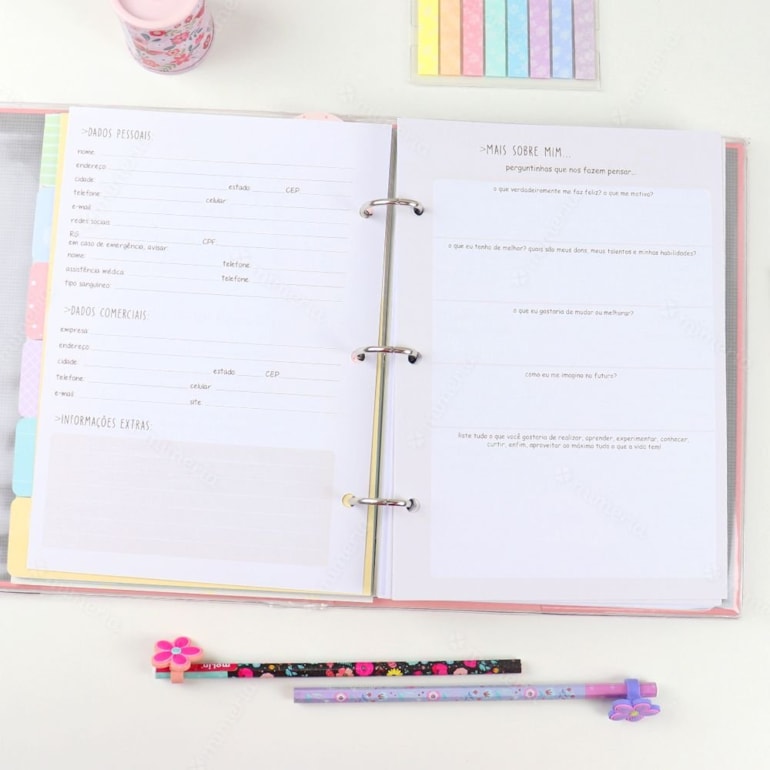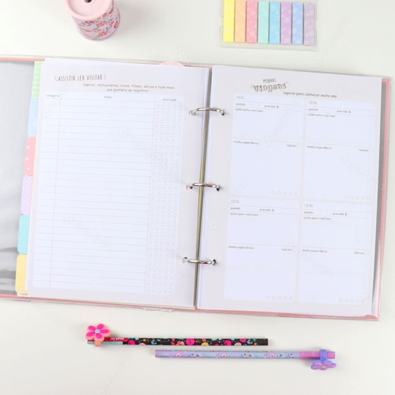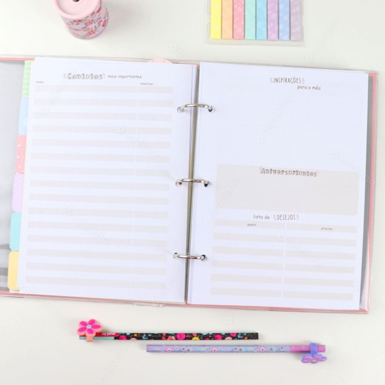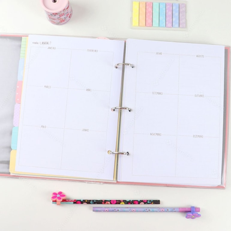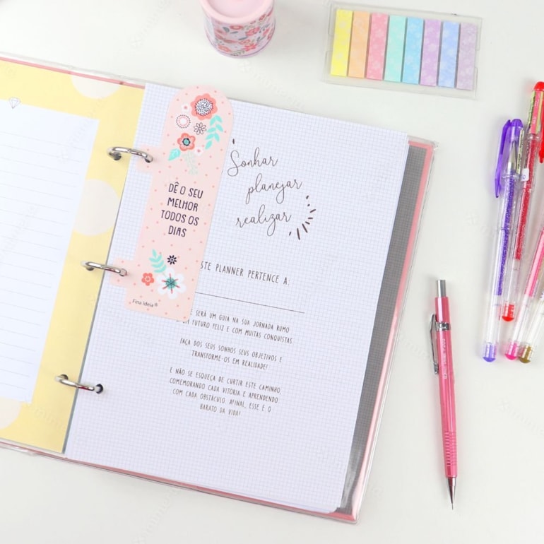 Produzido com material de alta qualidade, o planner é trabalhado com Hot Stamp, o que proporciona as estampas metalizadas de corações que são apresentadas. Traz também estrutura argolada – design de fichário que confere maior praticidade ao produto. Conta com 153 folhas – sendo 50 coloridas, 25 pautadas e 25 pontilhadas em 5 diferentes cores, além de ter 12 divisórias com estampas diferentes, 1 cartela de adesivos, 1 envelope para documentos, capa protetora e 1 marcador de páginas.