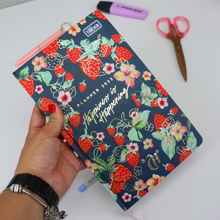 O Planner Capricho Morangos além de usual e prático, tem capa dura, com lombada quadrada e fechamento em elástico, e é todo estampado com morangos vermelhos e em hot stamping em dourado escrito: “Happiness is happening”. Um verdadeiro mimo! Um mimo para você usar na escola, trabalho, faculdade e muito mais!