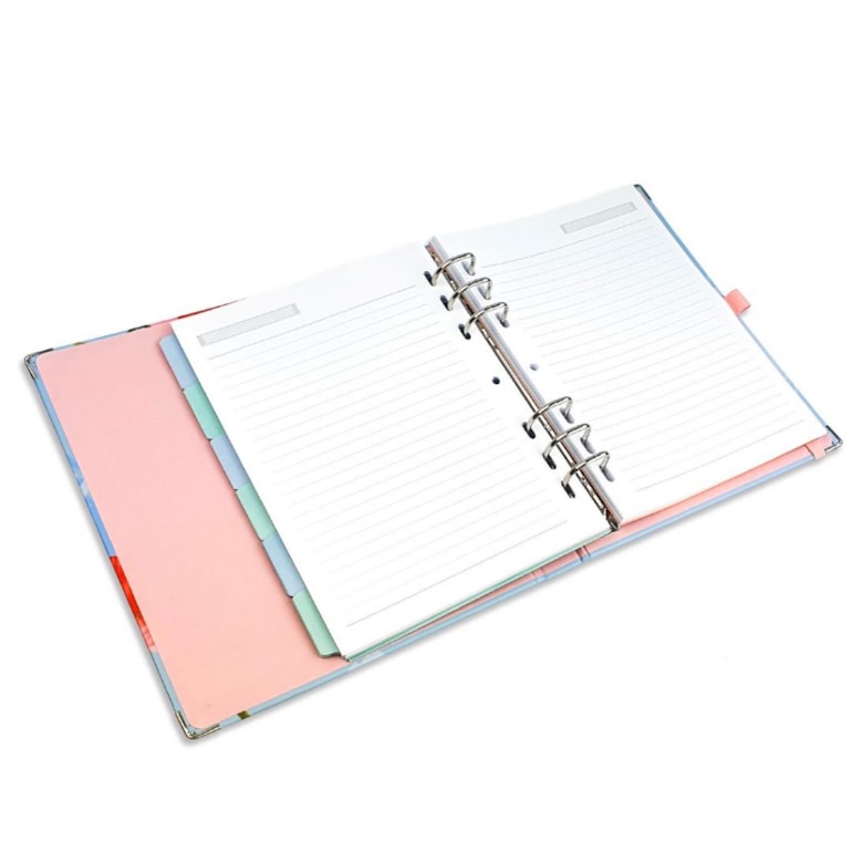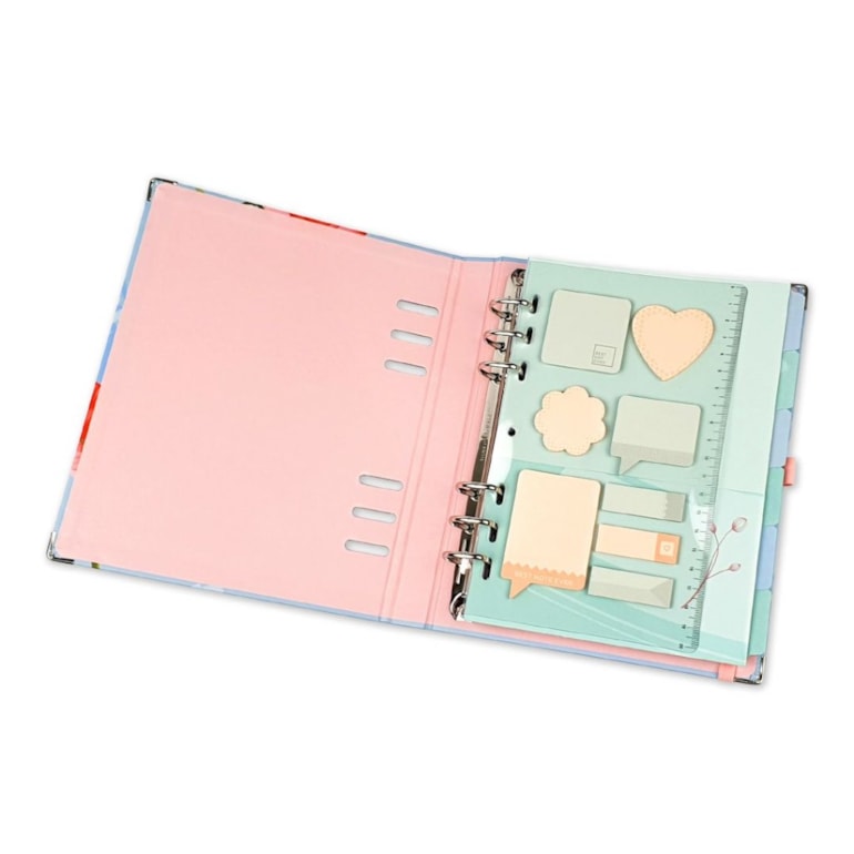 Com ótimo acabamento, esta planner tem estilo fichário, com seis argolas metálicas, e conta com capa dura estampada com flores rosas em fundo azul. Uma graça de planner para você combinar com outros itens de papelaria fina da mesma coleção!
