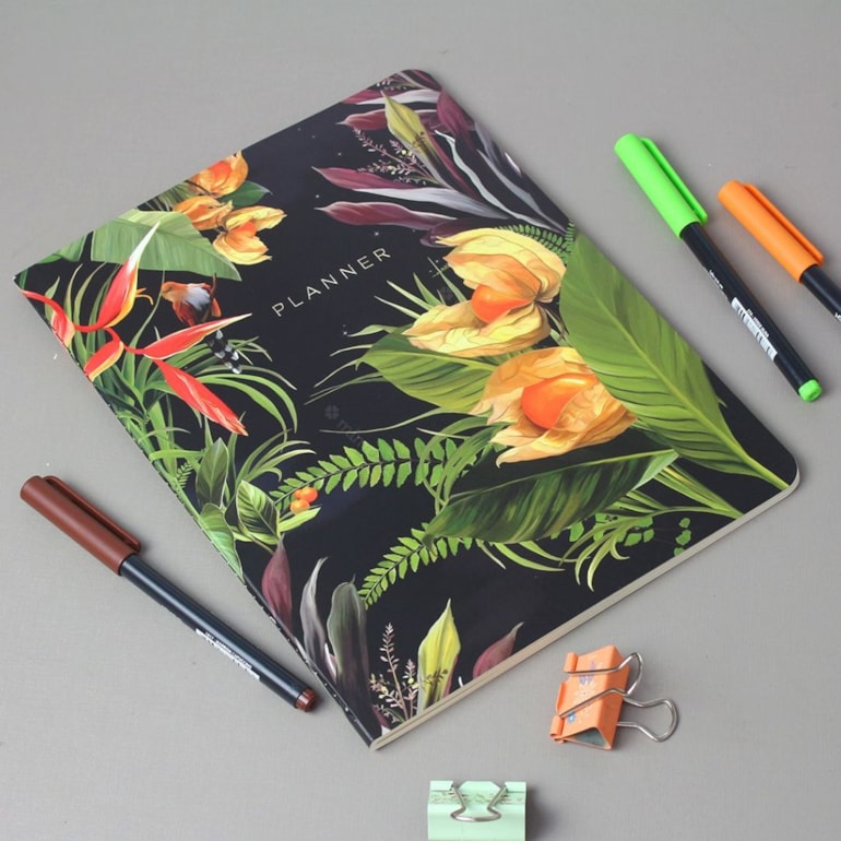 Lindo e bastante completo, conta com 68 páginas em papel pólen e uma capa majestosa trabalhada com flores, fisális e folhas sobre um fundo preto, o mimo que você precisava!