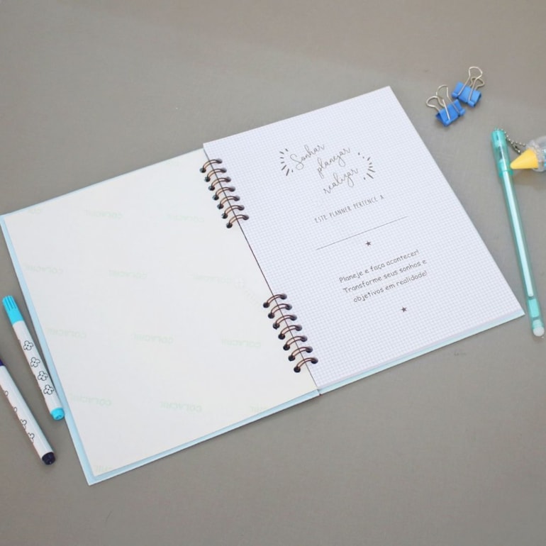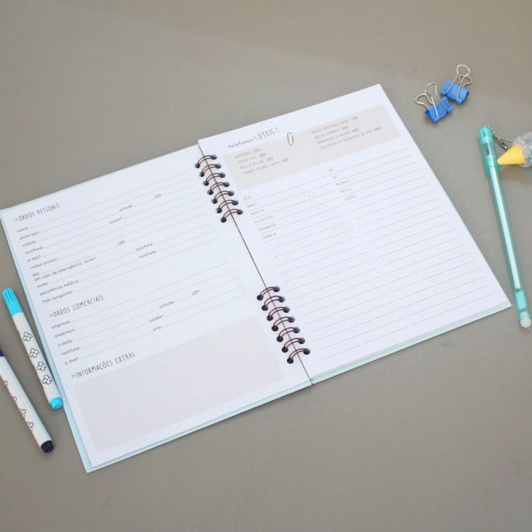 Prático, este planner tem miolo compacto com 32 folhas divididas em dados pessoais, telefones úteis, visão anual e planner mensal. Super usual!