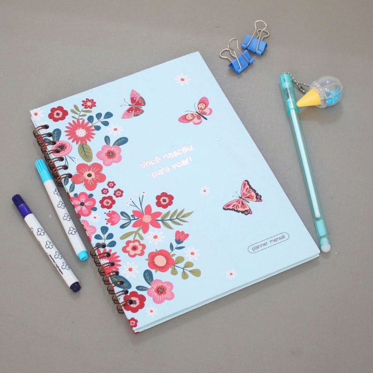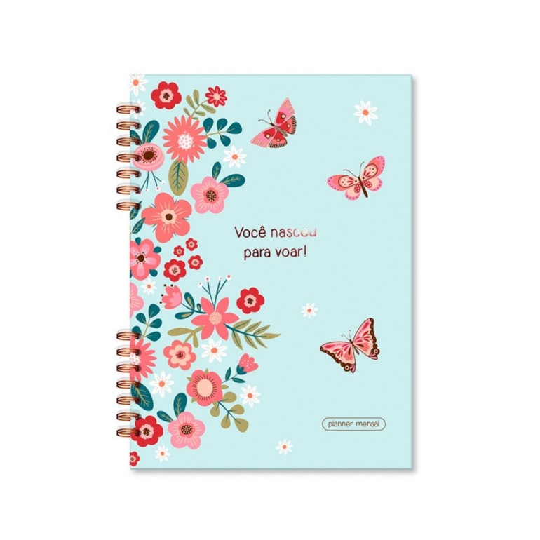 O Planner Mensal Borboletas tem acabamento em espiral e estampa lindíssima com a frase: “Você nasceu para voar” em fundo azul decorado com borboletas e flores. Um charme!