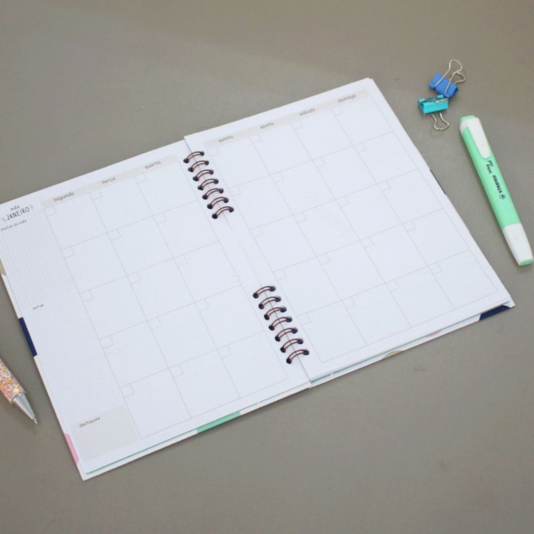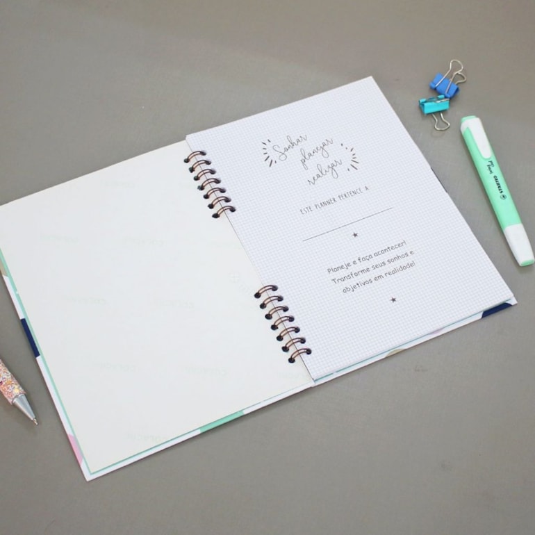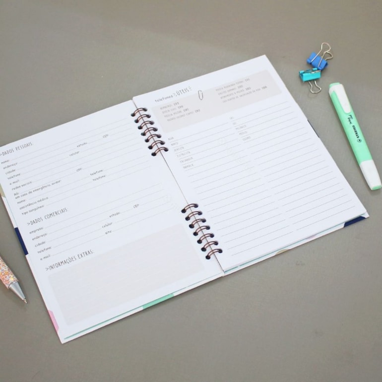 Produzido em materiais de alta qualidade, este planner tem acabamento em espiral, capa dura e miolo compacto, com páginas para dados pessoais, telefones úteis, visão anual e planejamento mensal.