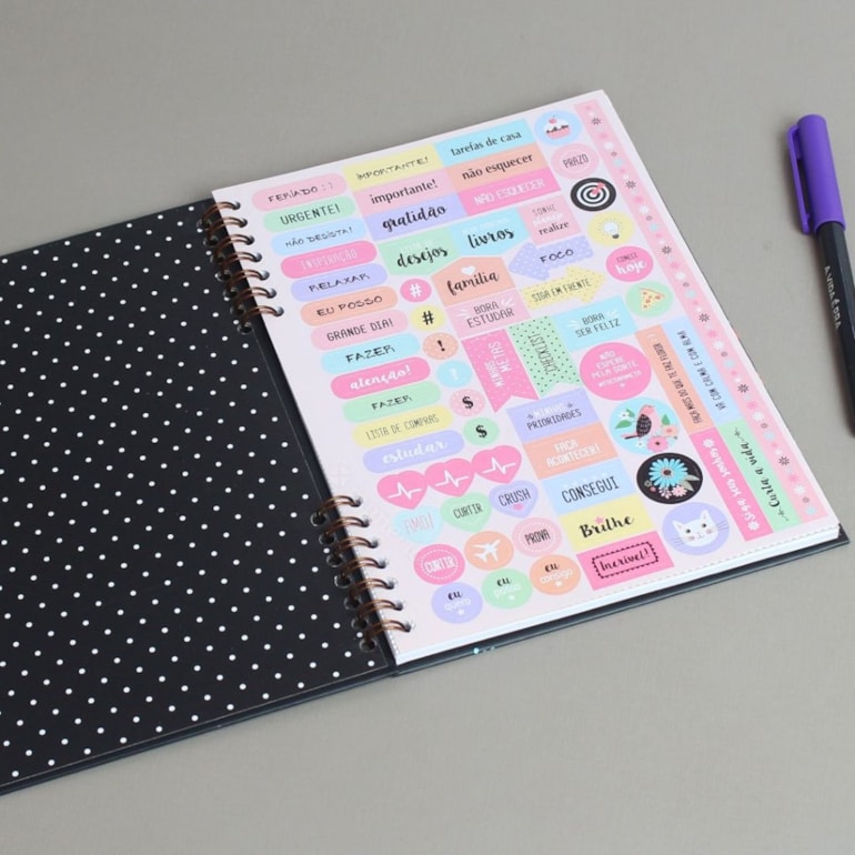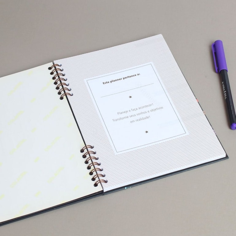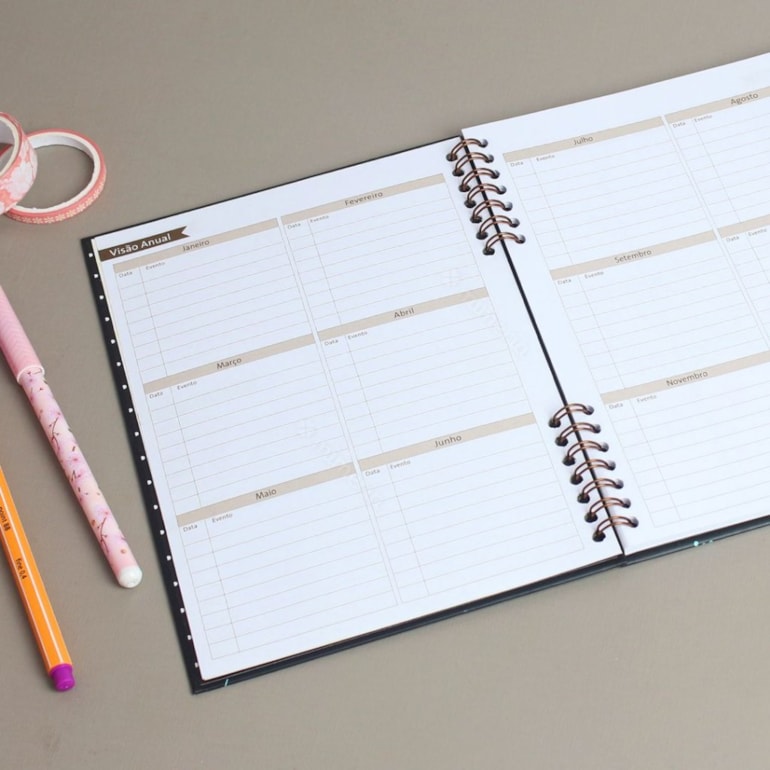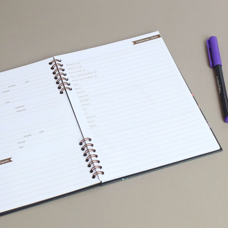 Super compacto, este planner vem com uma página para dados pessoais, uma para anotar telefones úteis, uma para agenda telefônica e o restante das folhas contam com espaços para você se organizar mensalmente, anotando seus compromissos, metas e muito mais!