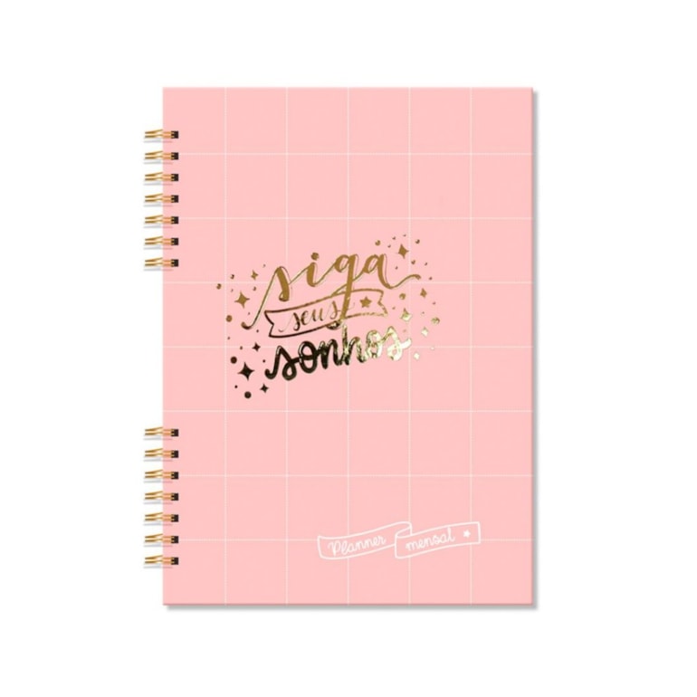 O Planner Mensal Rosa Quadriculado conta com capa dura estampada com a frase: “Siga seus sonhos” em fundo rosa quadriculado. Um verdadeiro mimo!