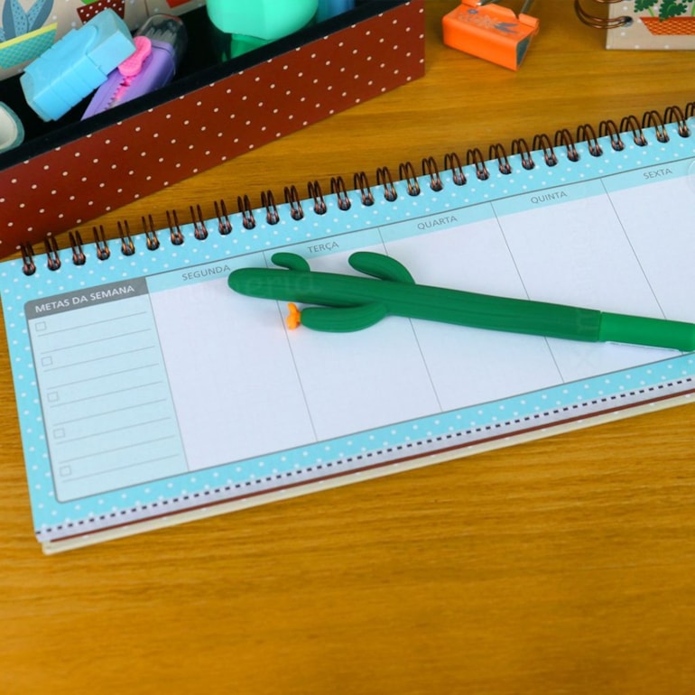 O Planner Organizador Semanal Cactos Bege é decorado com uma estampa fofíssima, em fundo bege, com vasinho de cactos, espiral rose gold e a frase: "Deixe nascer o melhor que existe em você”. Não é lindo? As folhas são decoradas com cores e detalhes alternados. Uma graça de organizador para você usar e decorar sua mesa de trabalho ou de estudos, no escritório ou em home office! Aproveite para combiná-lo com outros acessórios de papelaria e deixe seus momentos de organização muito mais encantadores!