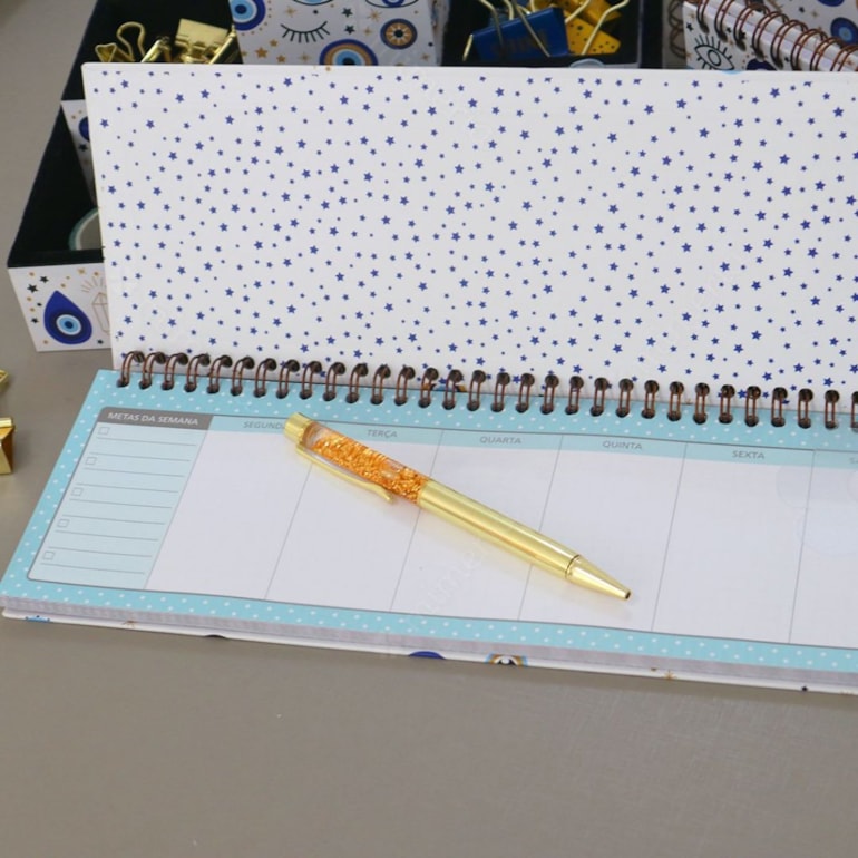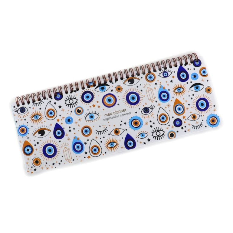 O Planner Organizador Semanal Olho Grego Branco vem todo estampado com diferentes tipos de olhos gregos com detalhes em azul, preto e dourado sobre um fundo branco, ele possui acabamento em wire-o de cor bronze e é incrível para ser deixado abaixo do seu teclado enquanto você executa todos os seus afazeres rotineiros!