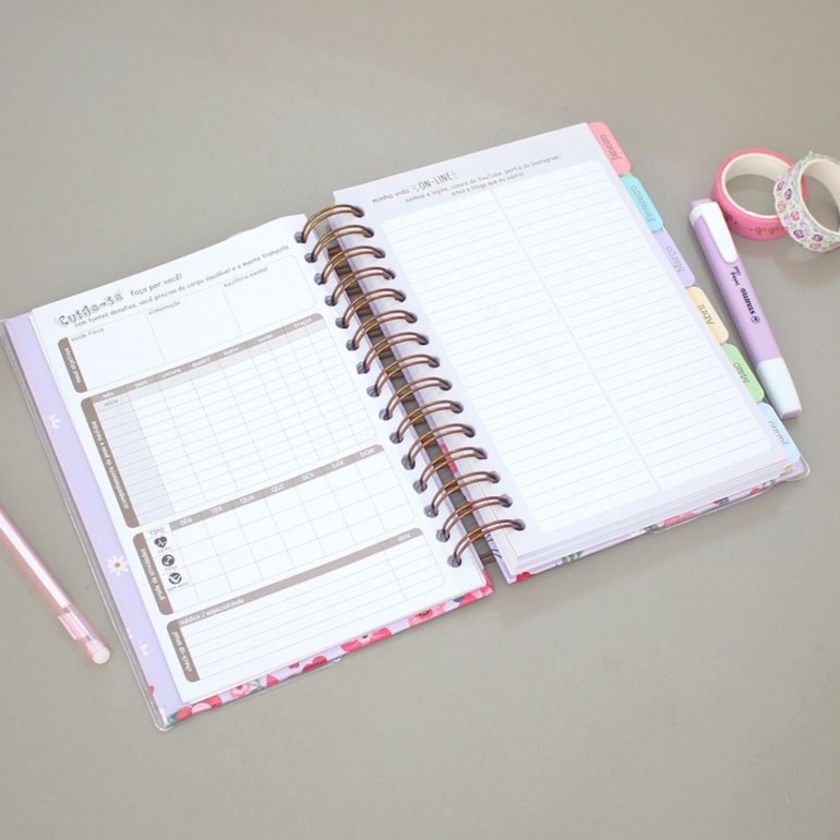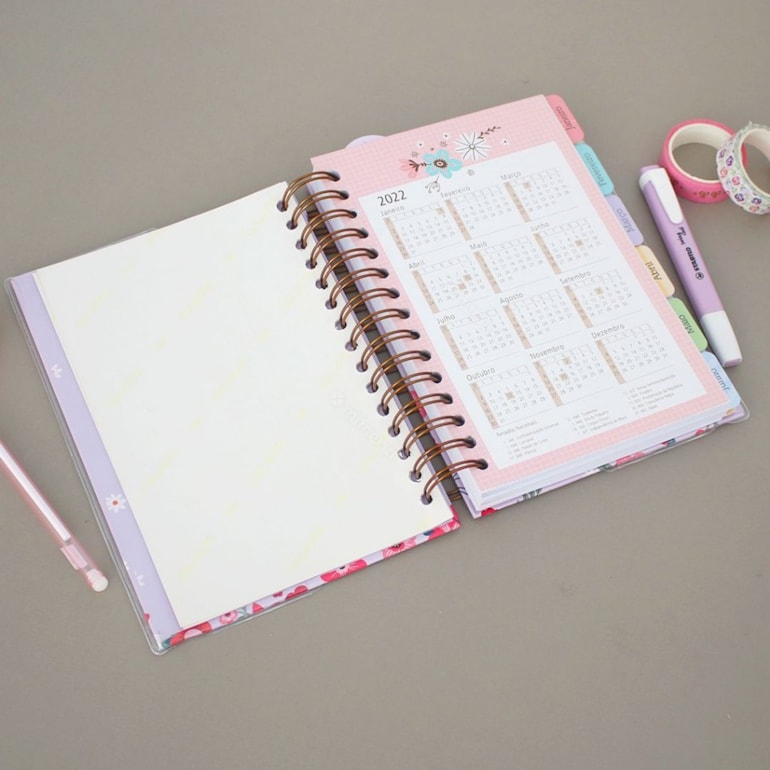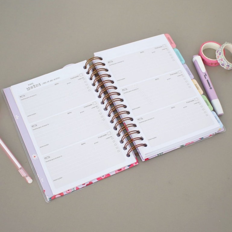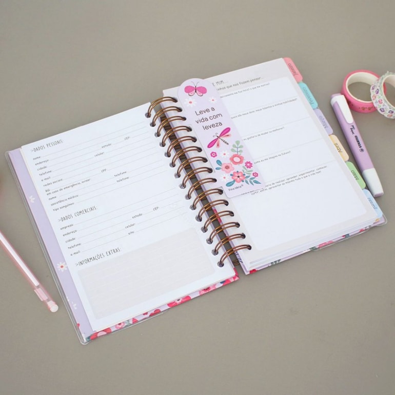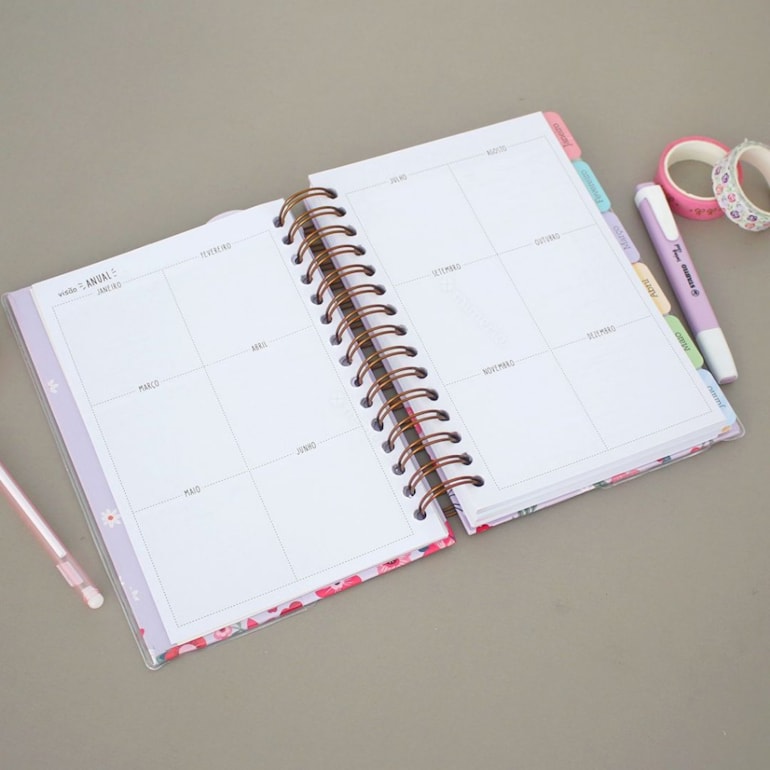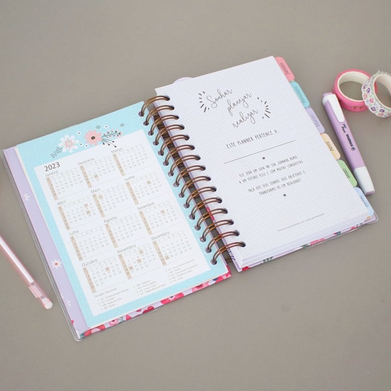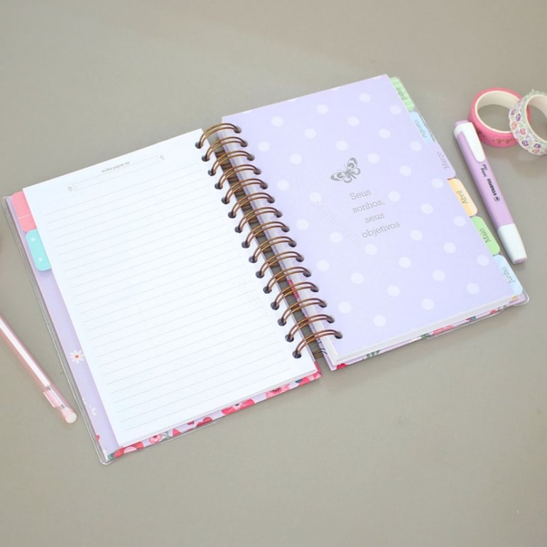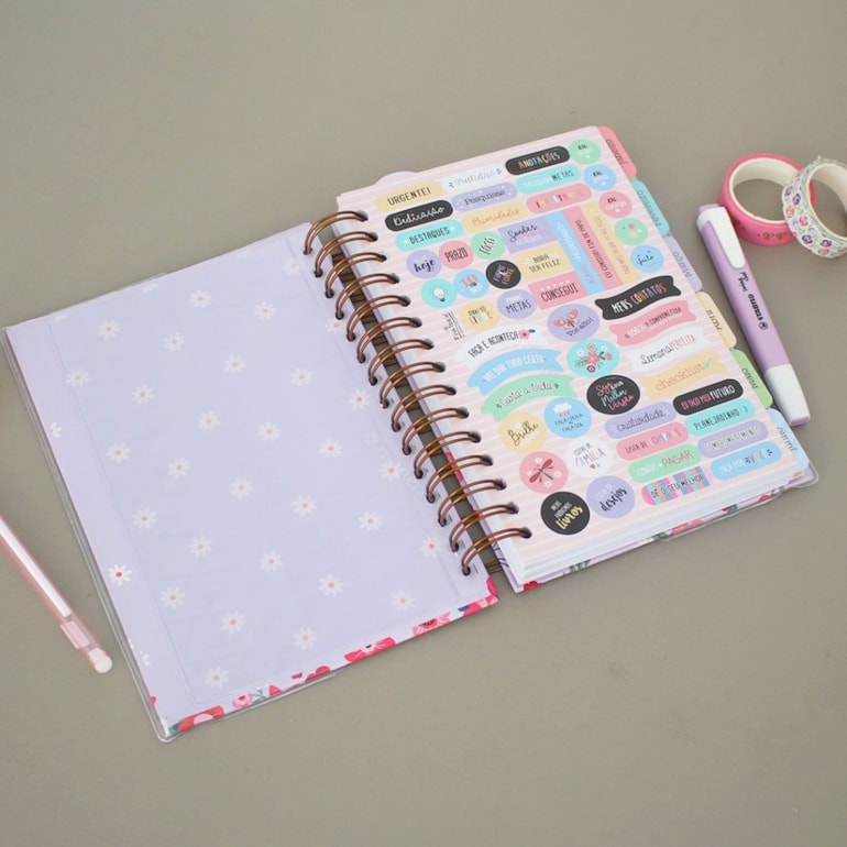 Produzido em materiais de alta qualidade, este planner tem acabamento fino e conta com miolo completo: com cartela de adesivos, divisórias, páginas para planejamento anual, controle financeiro, viagens e muito mais.